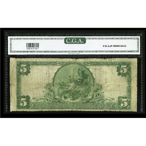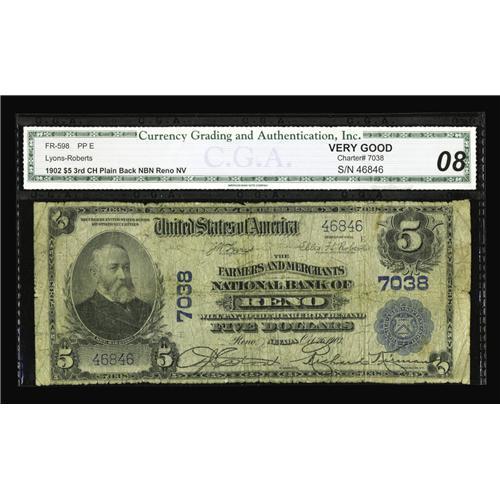 <B>Reno, NV</B></I> - $5 1902 Plain Back Fr. 598 <B>The Farmers & Merchants NB</B></I> Ch. # 7038<BR>Nevada, along with Arizona, share two features in common. One is a surging population, and the other is the virtual disappearance of any large size Nationals being offered on the market in recent months. This piece has been graded as <B>Very Good 8</B></I> by CGA, and appears to have no real problems save for plenty of even circulation.