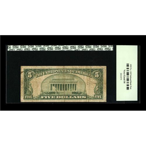 <B>Reno, NV</B></I> - $5 1929 Ty. 1 <B>First NB </B></I> Ch. # 7038<BR>Thanks to the existence of a small hoard of sheets, that has now been quite thoroughly dispersed, there are a number of high grade examples of the $5 Type 2 from here. Not so with the Type 1 of this denomination, which appears on the market far less frequently. <B>PCGS Very Good 10.</B></I>