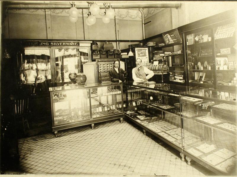 Two men pose inside the Butcher and Collins Jewelry Store. Photograph measures 7”x5”, black single matte 10”x8”, high contrast, and focus is sharp. Butcher and Collins and other signs can be read clearly. There is some minor fading on the right of the photograph. Photographer not identified. The Butcher and Collins Jewelry Store was located at 252 Virginia Street. Until 1915, the store was Butcher and Damon, but after 1915 the store probably became Butcher and Collins after Reno Jewelers, John W. Butcher and F. W. Collins joined forces. This photo is exceptionally crisp.