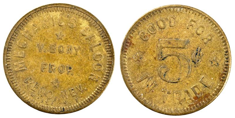 Obverse: Mechanic's Saloon / V. Bony / Prop. / Reno, Nev.; reverse: Good For / 5c / In Trade.