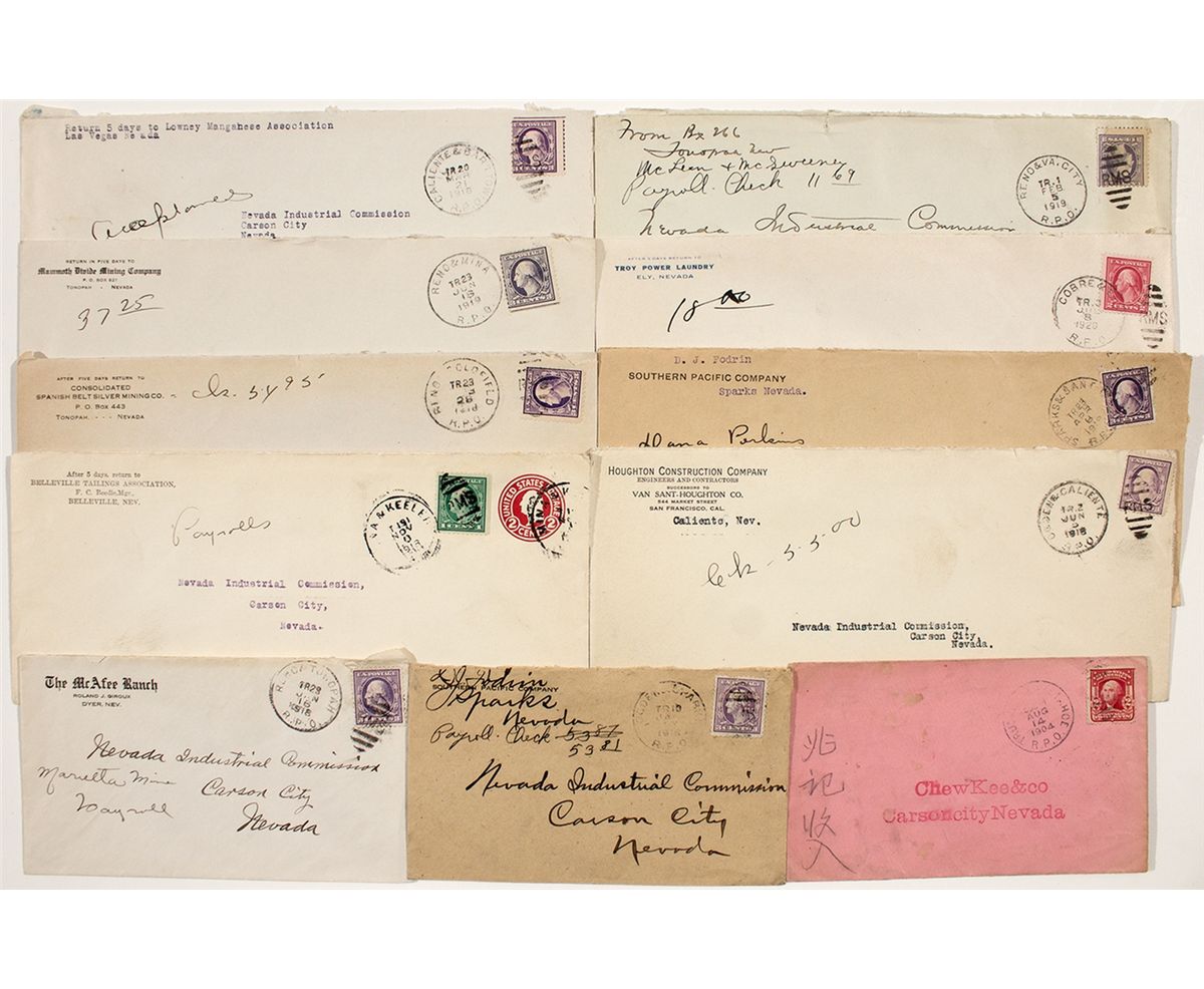 c1918 This is a lot of eleven covers all cancelled by railroad mail handlers on the Reno run. Cities represented include, Belleville, Sparks, Tonopah, Carson City etc. Good condition. These are from former Nevada State Treasurer Dan Franks' collection. - HKA#66047