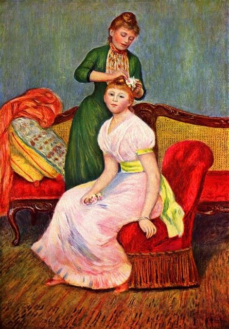 Artist: Pierre-Auguste Renoir 1841-1919 - Title: La Coiffure - Medium: Fine Art Reproduction Giclee on Canvas - Image Size: Approximately 20 inches x 14 inches - Unframed on Unstretched Canvas - Biography: An innovative artist, Pierre-Auguste Renoir wa