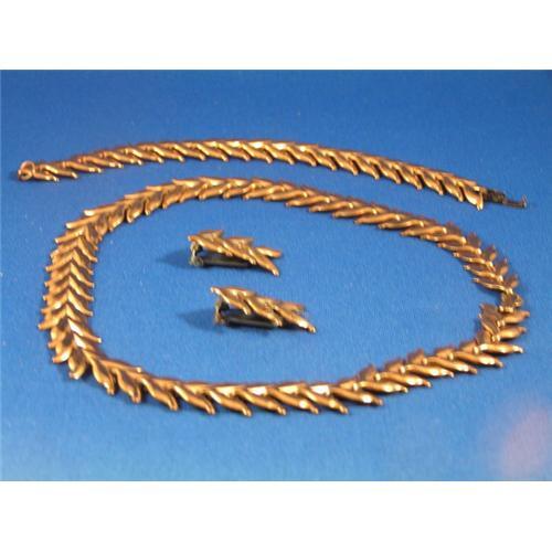 This is wearable art made by master copper craftsmen. Signed Renoir shiny copper set: 16" Necklace, 7" bracelet, earrings - 3 leaves each.