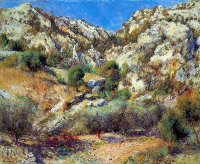 Artist: Pierre-Auguste Renoir 1841-1919 - Title: Rocks At L'Estage - Medium: Fine Art Reproduction Giclee on Canvas - Image Size: Approximately 16.5 inches x 20 inches - Unframed on Unstretched Canvas - Biography: An innovative artist, Pierre-Auguste