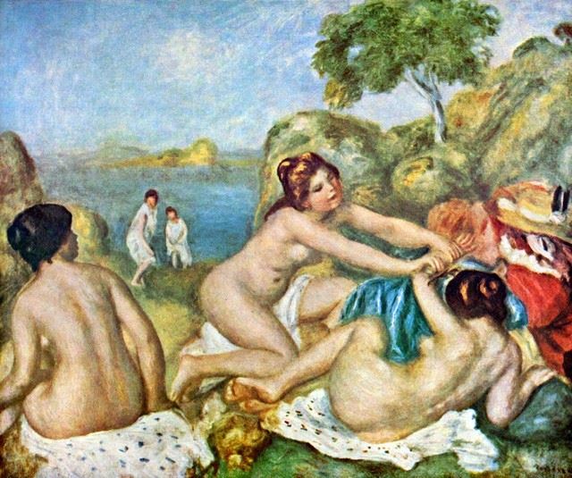 Artist: Pierre-Auguste Renoir 1841-1919 - Title: Three Bathing Girls With Crab - Medium: Fine Art Reproduction Giclee on Canvas - Image Size: Approximately 16.75 inches x 20 inches - Unframed on Unstretched Canvas - Biography: An innovative artist, P