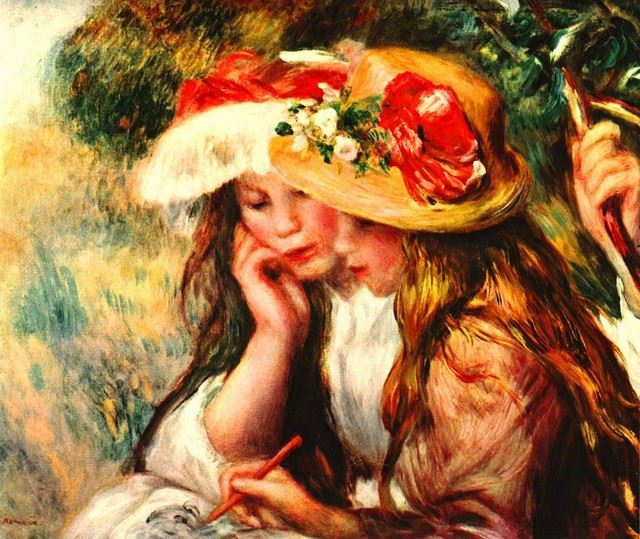 Artist: Pierre-Auguste Renoir 1841-1919 - Title: Two Reading Girls In A Garden - Medium: Fine Art Reproduction Giclee on Canvas - Image Size: Approximately 16.75 inches x 20 inches - Unframed on Unstretched Canvas - Biography: An innovative artist, Pi