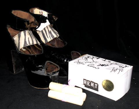 Rent - A pair of black patent leather platform shoes worn by Justin Johnston in his performance as "Angel" in the hit musical on Broadway. Also included is a white cardboard candle box containing 3 candles. The box is signed by the entire cast with a sticker that reads "10 Years on Broadway" with dates. Obtained at the famous Broadway Cares Flea Market held annually in NYC. Box: 4" x 7" x 3"