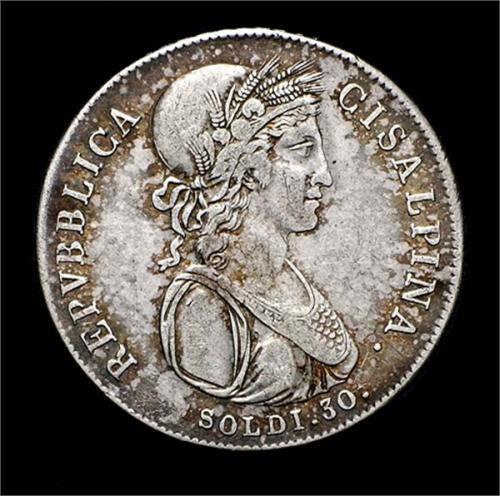 Repubblica Cisalpina (1800-1802) - 30 soldi anno IX (1801) Zecca: Milano - Diritto: effigie muliebre a destra - Rovescio: leggenda in righe orizzontali - Tracce di colla al rovescio - Da esaminare