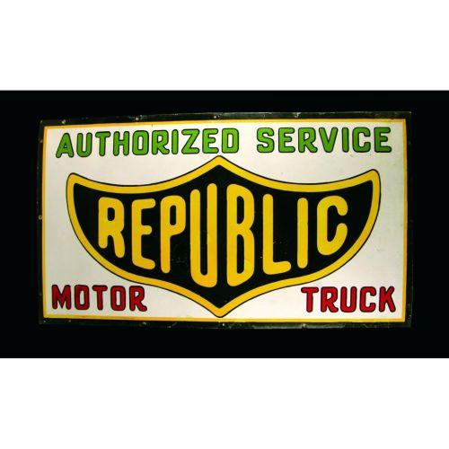 Republic Motor Truck Authorized Service, marked this sign Property Of Republic Truck Sales Corp., Alma, MI. A few silver dollar size chips that have been touched up otherwise very good condition. 48 X 27 inches.