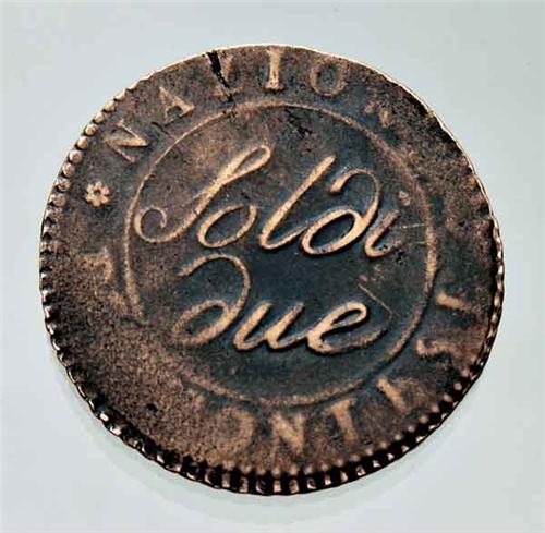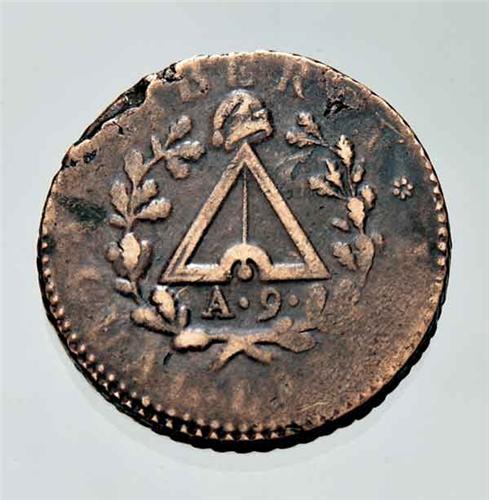 Rep. Subalpina - 2 Soldi - 9° - Ae - 1 Soldi anno 9° (1800-1801) Zecca: Torino - Diritto: valore in lettere su due righe - Rovescio: simbologia della Rivoluzione racchiusa entro due rami di quercia intrecciati alla base - Mancanza di metallo sul bordo del rovescio - Da esaminare