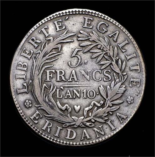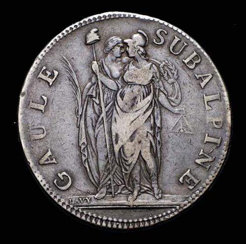 Repubblica Subalpina - 5 Franchi anno 10° (1801-1802) - Zecca: Torino - Diritto: due figure allegoriche stanti, con simboli della Rivoluzione Francese - Rovescio: valore, data e segno di zecca entro due rami di palma e di alloro intrecciati alla base -