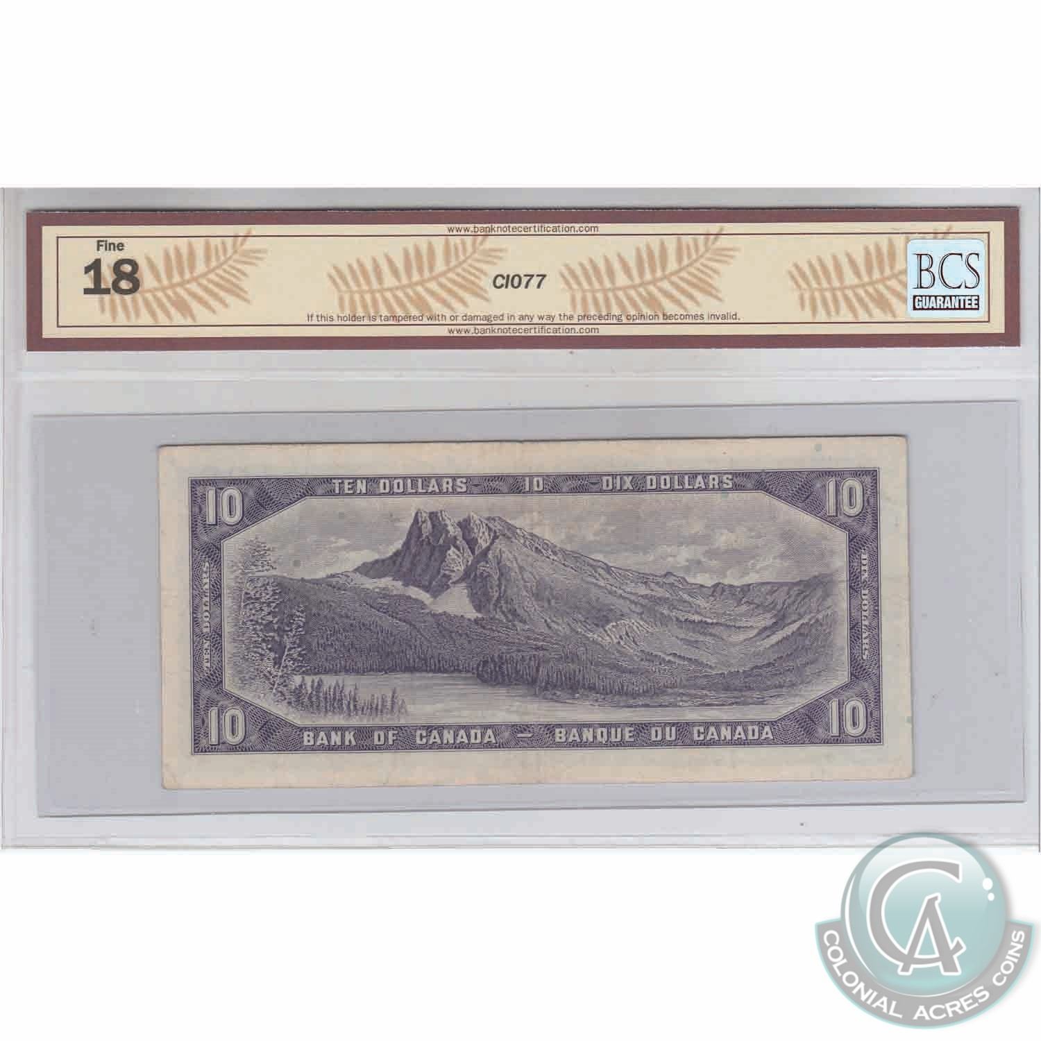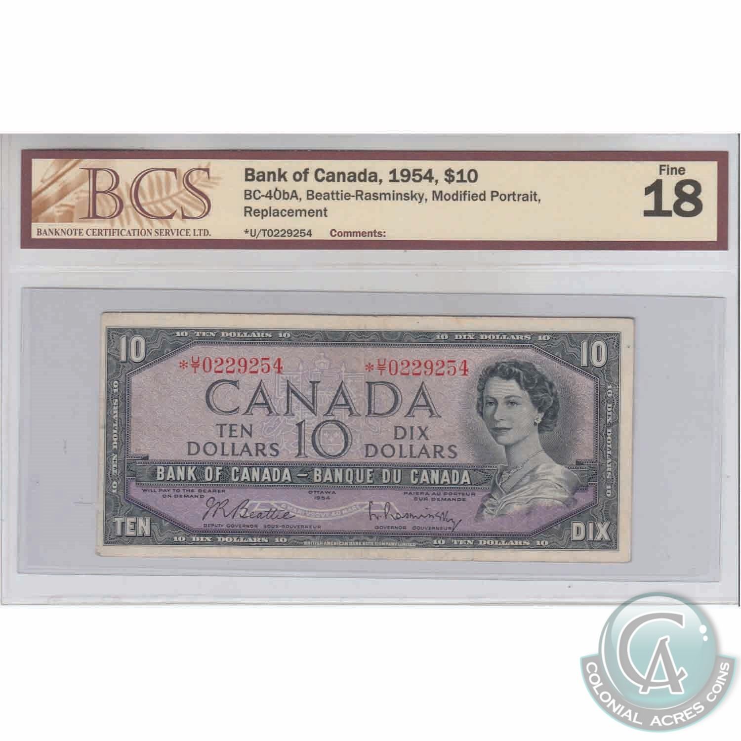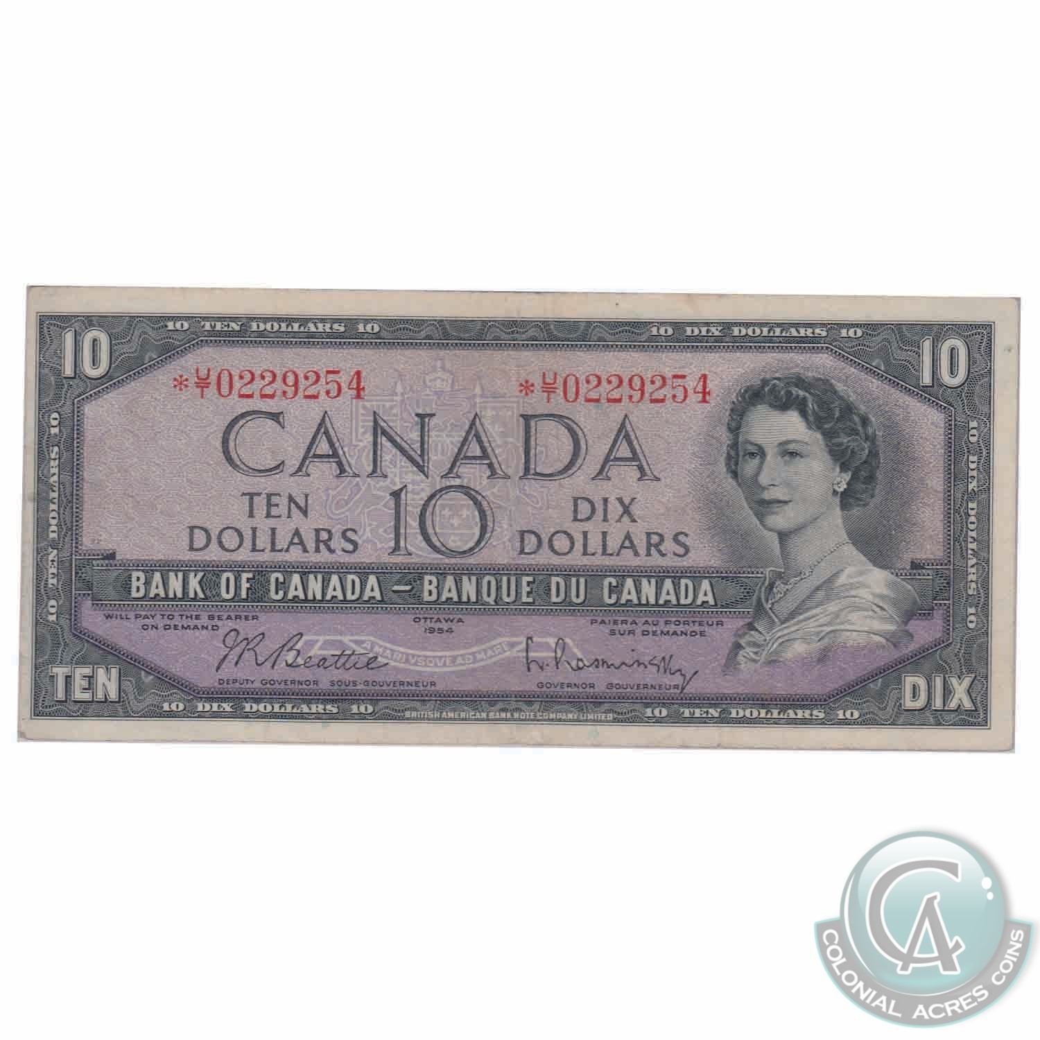 Replacement BC-40bA 1954 Bank of Canada $10, Beattie-Rasminsky Replacement, *UT 0229254 BCS F-18