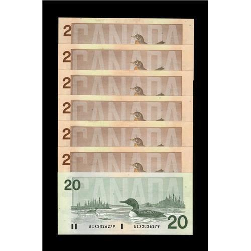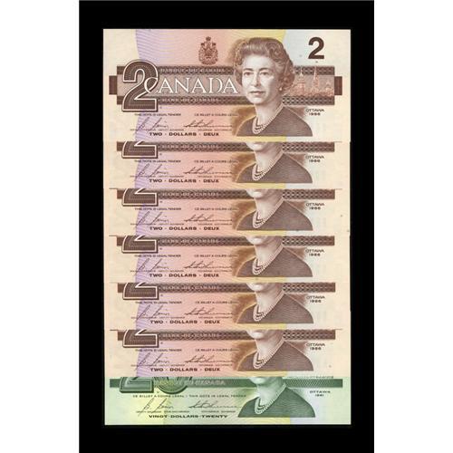 <B>Replacement Grouping.</B></I><BR><B>BC-55bA $2 1986. Six Examples</B></I><BR><B>BC-58bA-i $20 1991.</B></I><BR>All of these notes are blessed with strong embossing. The "X" in the third prefix letter position indicates that these are replacement notes. Five of the $2s are consecutive.<BR><I>From The Collection of Richard A. Beck</B></I>