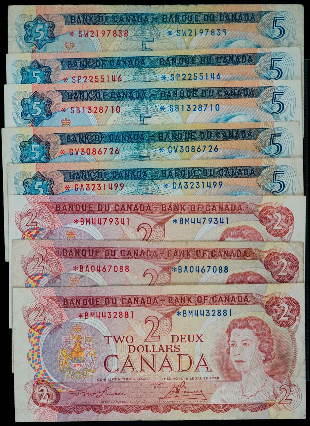 Replacement Lot; Includes 1974 $2'S & 1972 $5'S with various signatures, prefix. Some better ones. Fine to Gem Unc. Lot of 8 notes.