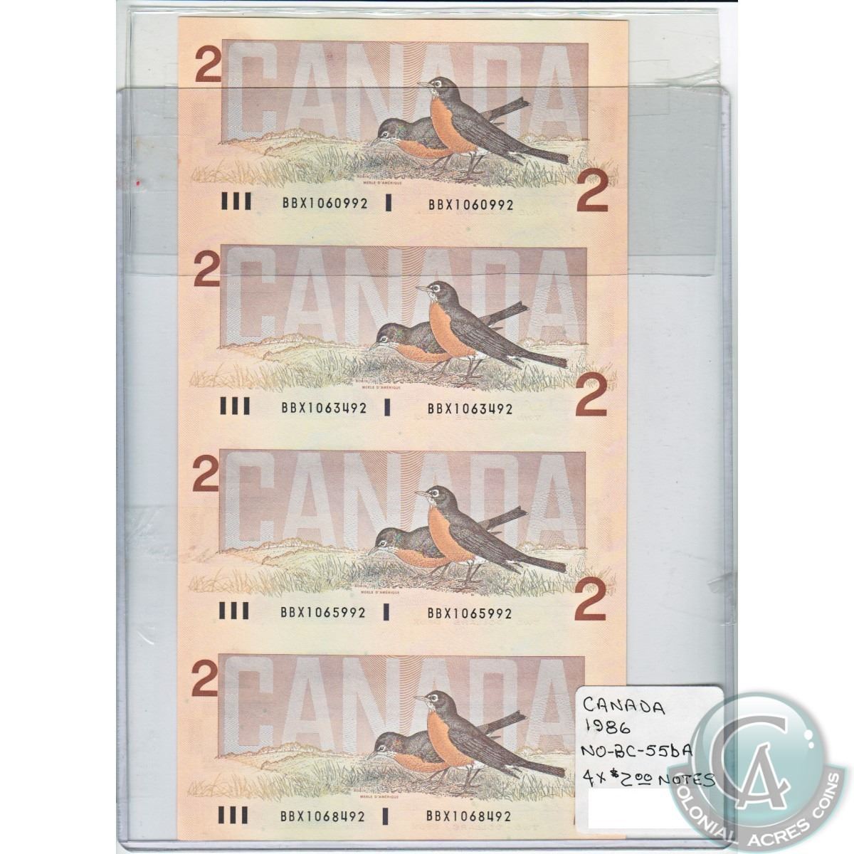 Replacement Uncut sheet of 4x 1986 BC-55ba Canada Bird series 2.00 BBX Banknotes.
