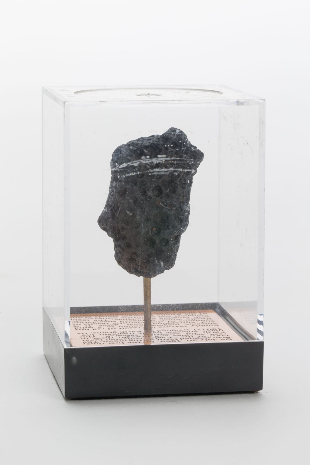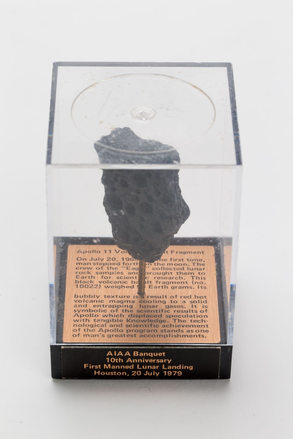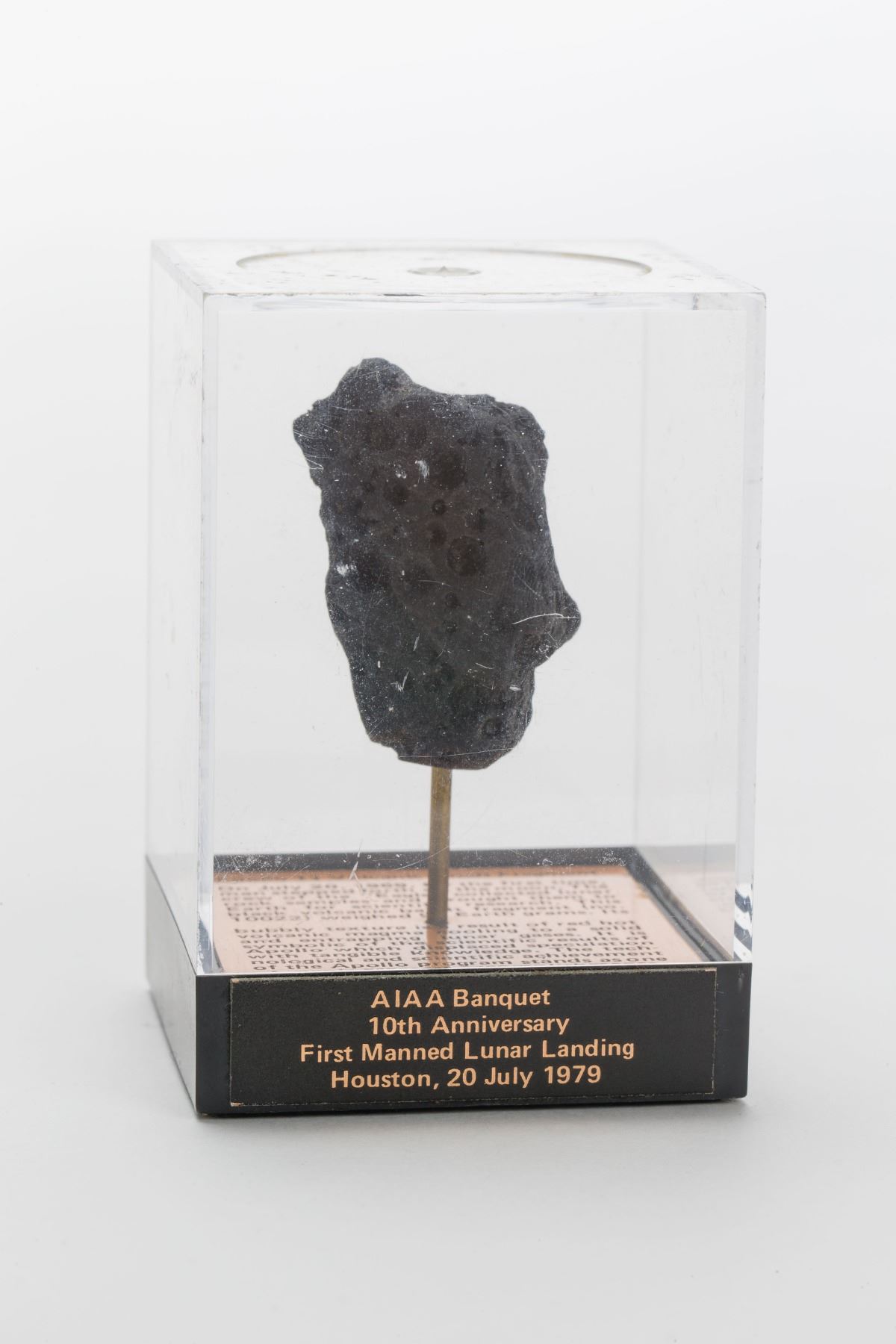 Replica of a lunar volcanic basalt fragment recovered during the Apollo 11 mission, produced for a special American Institute of Aeronautics and Astronautics (AIAA) banquet honoring the tenth anniversary of the first manned lunar landing, held in Houston on July 20, 1979. The replica fragment is displayed within a 2.25? x 3.25? x 2.25? display case, with informational text on the base. In fine condition.