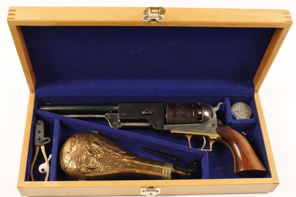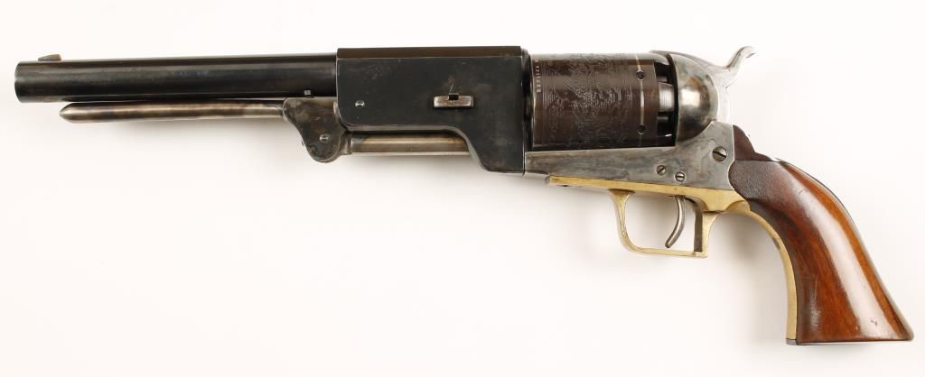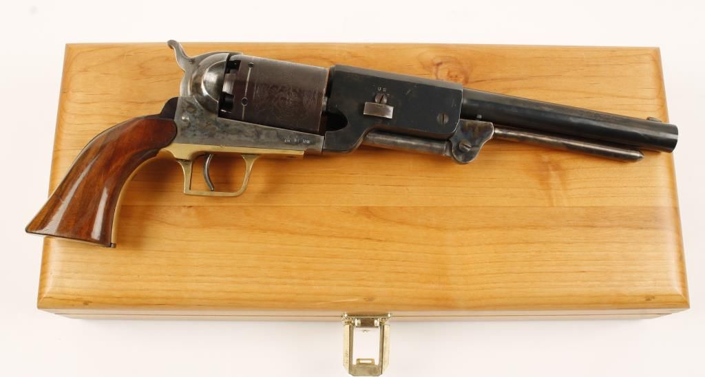 Cased replica black powder single action 6-shot percussion pistol. Blued 9" barrel. Case colored loading lever, frame, hammer and trigger. Blued and roll-stamped cylinder showing an indian battle. Brass square-backed trigger guard. Blued backstrap not cut for a shoulder stock. Lined hardwood case with loading and maintenance tools and a key. Condition is good. *Antique Firearm*