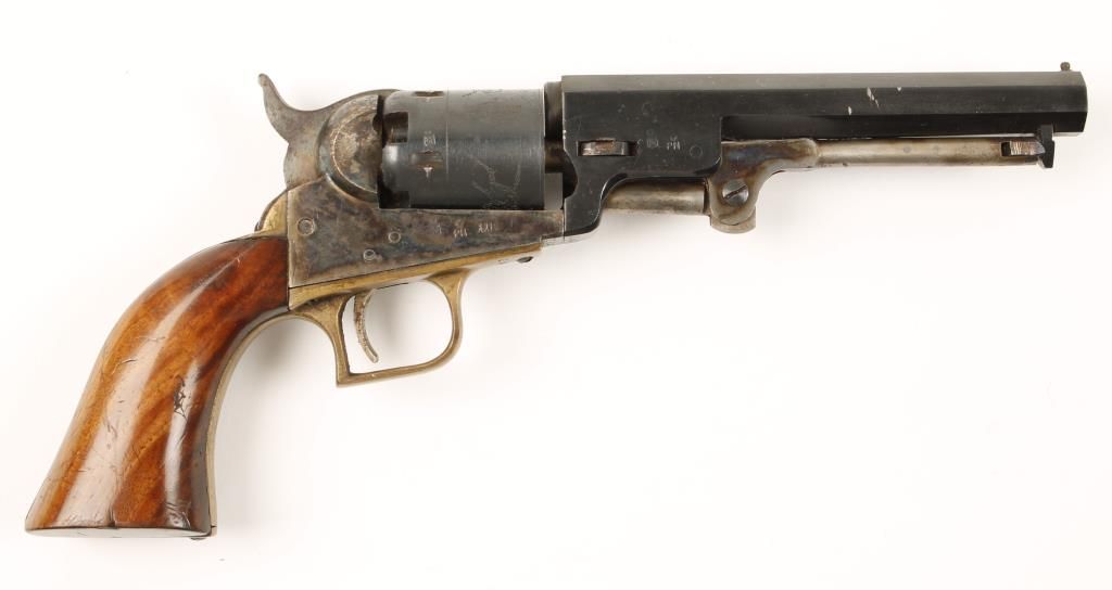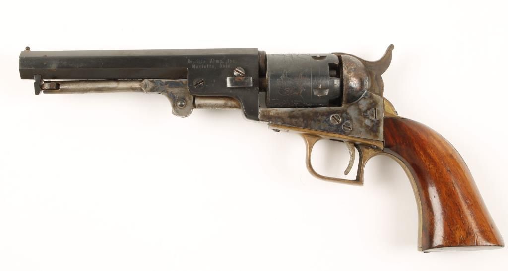 Replica black powder single action 5-shot pistol. 6" octagonal barrel. Color cased loading lever. Engraved cylinder showing an indian fight scene. X Case colored short frame, hammer and trigger. Brass square backed trigger guard. Brass backstrap. Not milled for shoulder stock. Condition is fair with surface rust and blemishes. *Antique Firearm*
