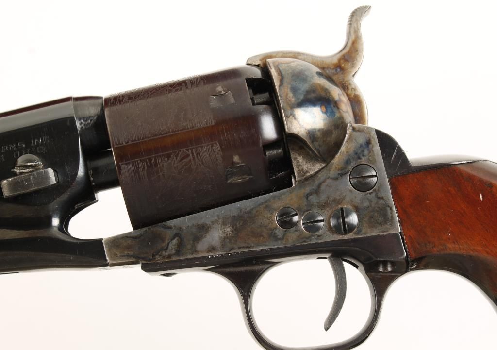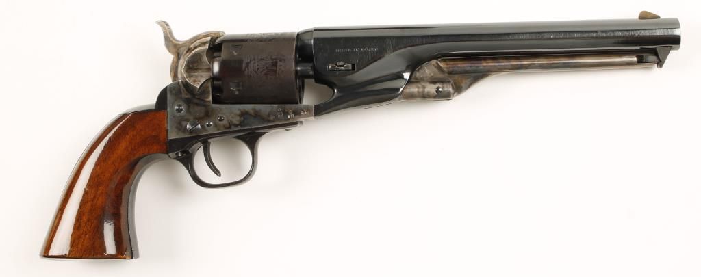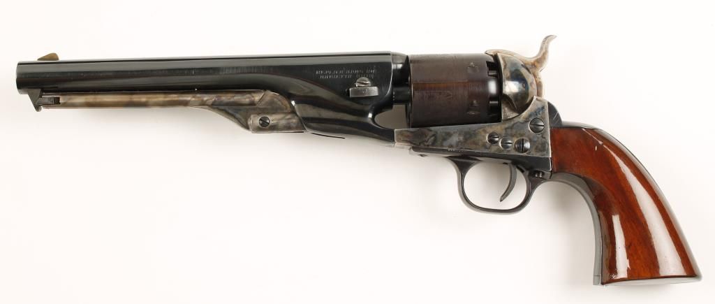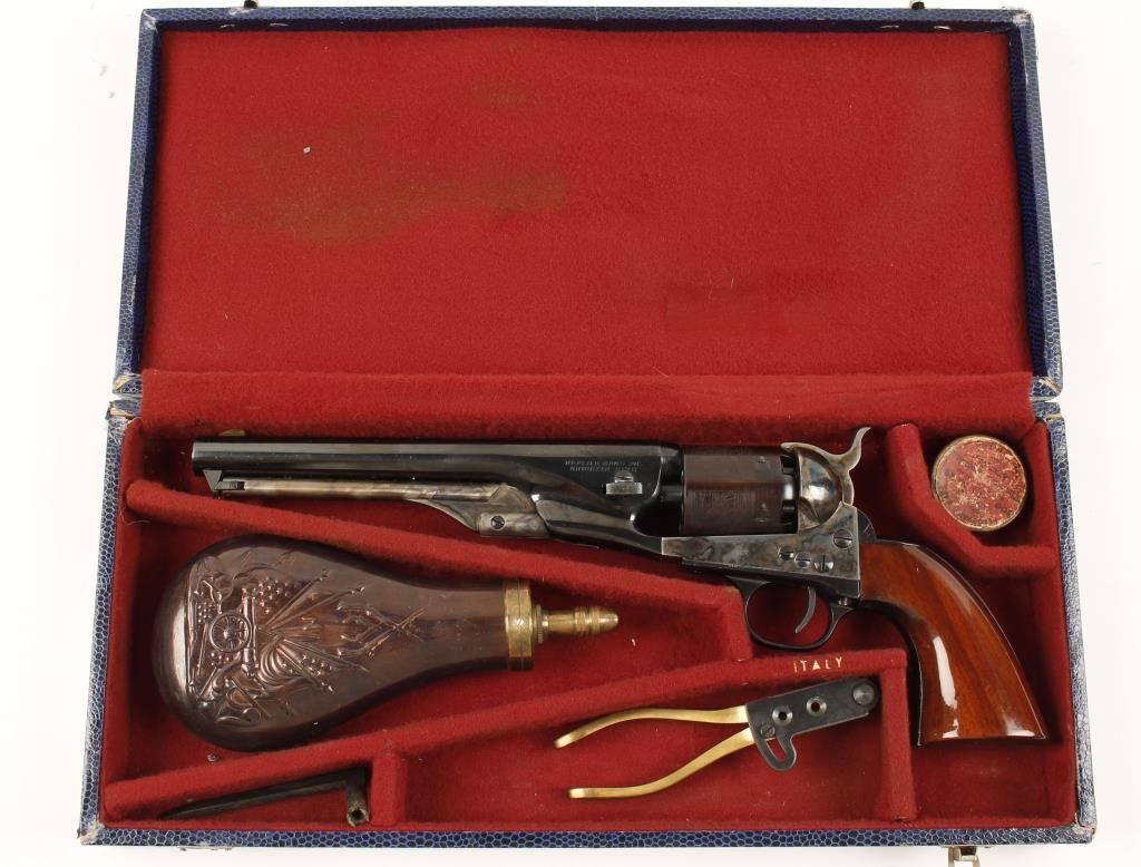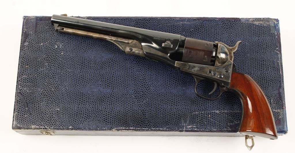 Replica black powder single action 6-shot percussion pistol. Blued 7-1/2" barrel with "1863 Gettysburg 1963". Case colored loading lever, frame and hammer. Blued and roll-stamped cylinder showing a naval engagement. Blued trigger guard and backstrap. Cut for a shoulder stock. Blue reptile skin textured lined wood case with loading and maintenance tools. Case has a broken latch on the front. Condition is like new in box. *Antique Firearm*
