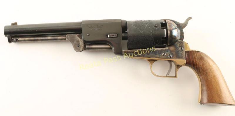 'Second Model' Italian made reproduction single action percussion revolver chambered for .44 caliber ammunition, circa 1968. Features a blued & case hardened finish, 7.5" half octagonal barrel, brass blade front sight, notched rear sight on the hammer, loading lever, roll stamped six-shot cylinder with battle scene, brass backstrap & square-back triggerguard, checkered hammer spur and one piece walnut grips. Revolver retains approximately 93% of it's original finish showing bright case colors, light handling marks/scratches, a few minor losses on the barrel and some tool marks on & around the barrel wedge. Action is smooth, bore is very good and wood grips are excellent. Condition is very good. ***Antique Firearm***