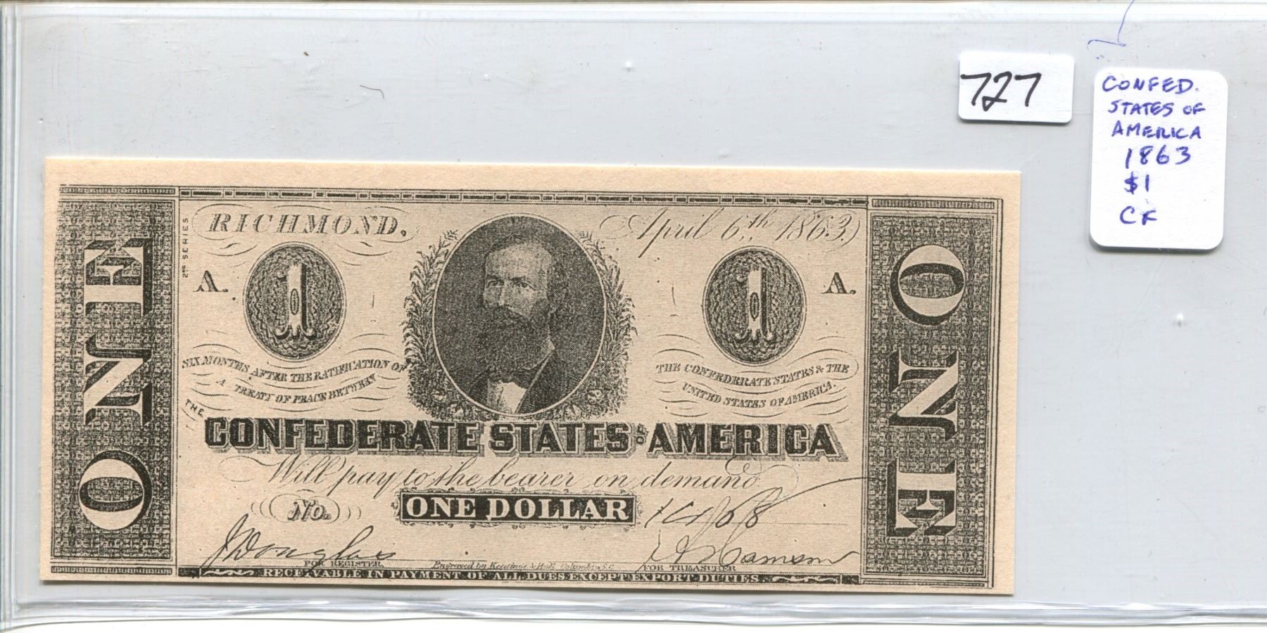 Replica of a Confederate States of America 1863 $1. Richmond, Virginia. Not a real note.