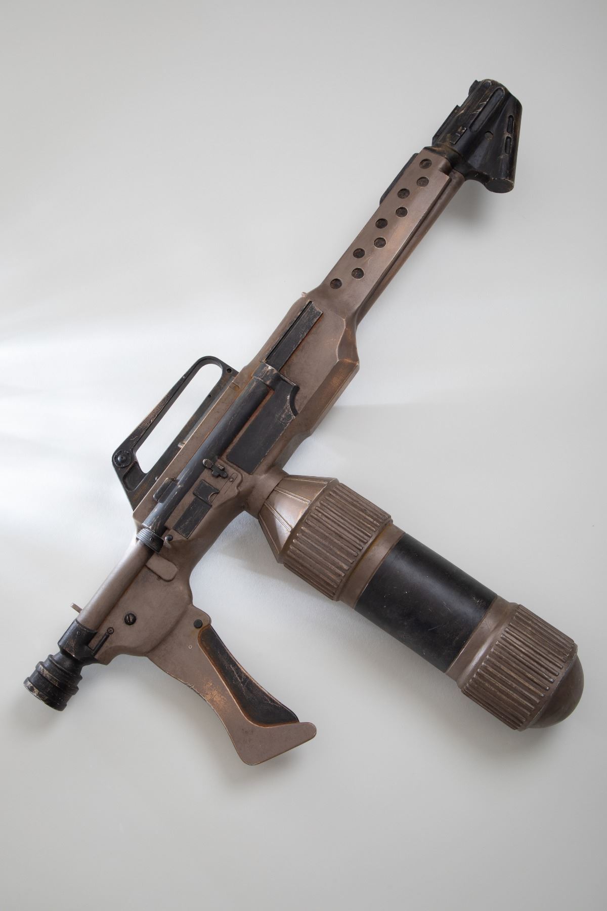 Replica static flamethrower made by Greg Jein from the movie “Aliens”. Made of wood. Well distressed. Virtually identical in appearance to authentic flamethrower used in filming. From the collection of Greg Jein. Comes with a Certificate of Authenticity from Studio Auctions.