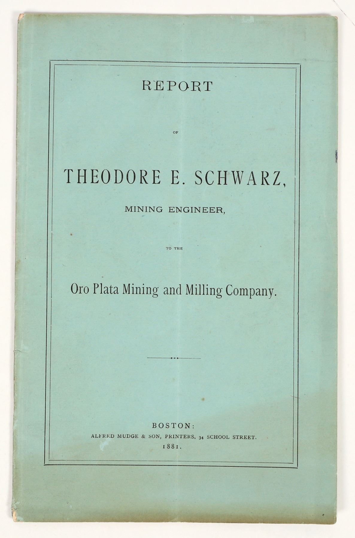 Rare Calaveras County mine. Report of Theodore E. Schwarz, Mining Engineer to the Oro Plata Mining and Milling Company. Afred Mudge & Son Printers, Boston, 1881. 19pp with map. Company properties are within 2 miles of Murphys: the Oro Plata and Pay Rock Lodes. Large central fold, toning. 9 x 6"