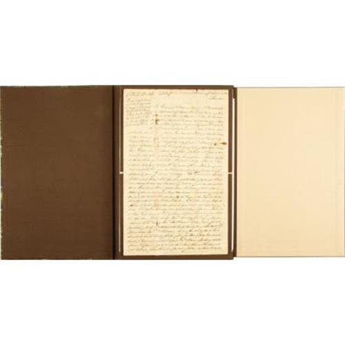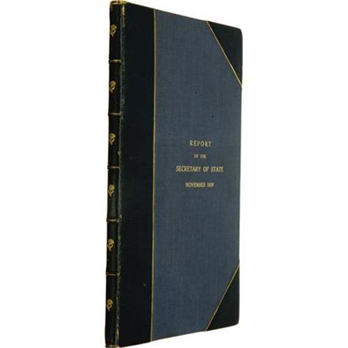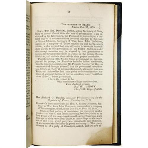 <B><I>Report of the Secretary of State, November, 1839</B></I></B></I><I>.</B></I> (Austin: Whiting's Print, 1839.) 38 pages, 5" x 8". Modern three-quarter gilt morocco and cloth. The main report is from Acting Secretary of State David G. Burnet to President Mirabeau B. Lamar, followed by six documents, labeled A through F. A and B relate to the outrages of the Indians on the frontier and to the entrance of General Thomas J. Rusk into U.S. territory in the Indian campaign. The report contains a communication "<I>from John Emberson, captain of a company of Texas Rangers on our north-eastern frontier...in order that prompt measures may be adopted by that government [U.S.] to prevent the threatened invasion of Texas by the Indians therein...</B></I>" An early printed reference to the Texas Rangers. Soiled at lower edge of first three sheets and lower corner of each page. Very good condition. Contemporary partial leather, blue cloth binding, with considerable wear at leather edges. Gilt floral design on spine, gilt lettering on cover: "<I>Report/of the/Secretary of State/November 1839</B></I>." <I>From the collection of Darrel Brown.</B></I><BR><BR><B>Reference:</B></I> Streeter 351: Streeter locates only four copies. <BR><BR><b>Shipping:</b> Books & Catalogs (<a target="_blank" href="http://www.heritageauctions.com/common/shipping.php">view shipping information</a>)