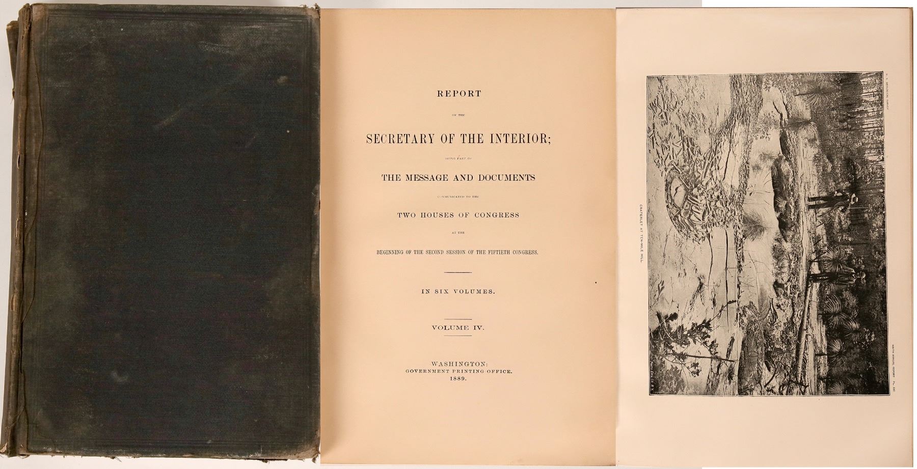 Lot of 1. Report of the Secretary of the Interior, Vol. 4 of 6: Being Part of the Messages and Documents Communicated to the Two Houses of Congress at the Beginning of the Second Session of the Fiftieth Congress of the Fifty-Third Congress; in six volumes. Volume IV. Washington 1889. Early studies of EQ 209-536. The major paper.