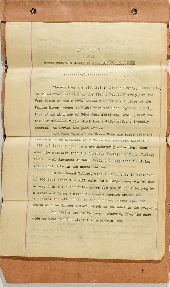 Eighteen page report from H.P. Sellon for this mine located near Crescent Mills and the Indian River. Detailed discussion and description of the mines, previous work, assay results, present conditions, etc. Ends the report by stating that there is :sufficient ore to warrant the outlay." No date can be found anywhere in the document, but the company has roots back into the 19th century.