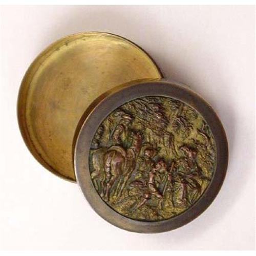 Lovely repousse bronze pill / trinket box with figures of men and horses. In good used condition as shown. Please ask questions, request additional photos and shipping costs before buying.
