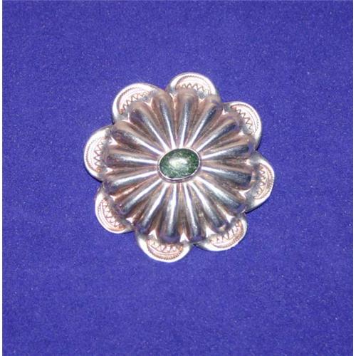 Slightly dome shaped this is a fabulous vintage Mexican Sterling Silver Brooch or Pin, hand crafted in a Repousse stylized floral design with perimeter pedals slightly turning upward, centered with a bezel set oval shaped unpolished Cabochon. Beautiful silversmith work, weight, unsigned, measuring 2 inches in diameter; Beautiful!