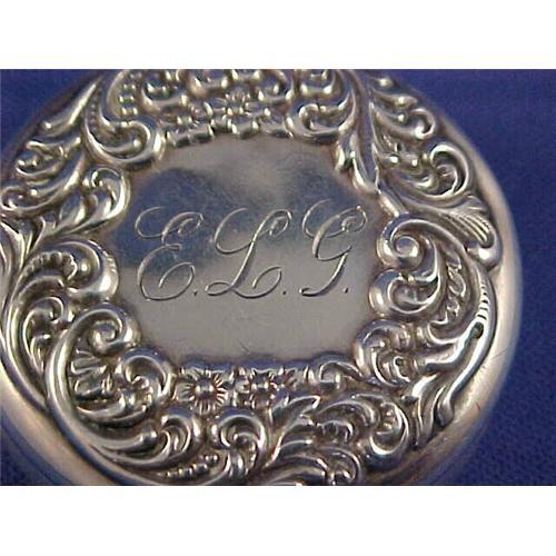 This lovely round covered box features an intricate Victorian style repousse design and fancy monogram. It measures 1.5" across and .75" tall. The inside is lightly gold washed, and the bottom is marked sterling 925. There are shallow dents on the side and bottom. Otherwise, this piece is in very nice condition. Shipping to US addresses is $4.