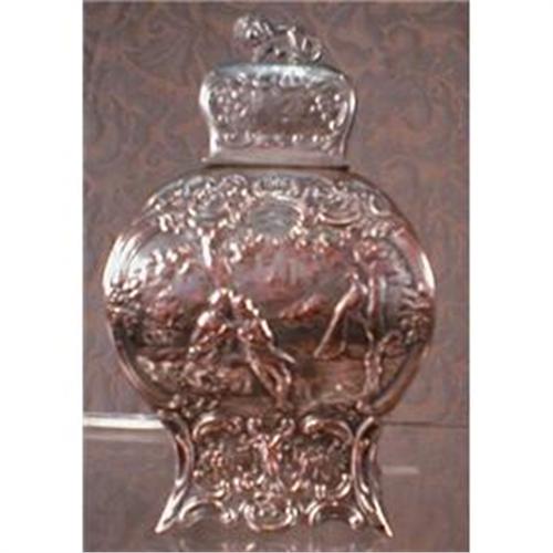 </font></strong>Fancy repousse scenic tea caddy with lion finial. Baroque bombé form.<p>On the front and back are two lovers on a bench in a garden. Beside them is a peacock in a tree. The