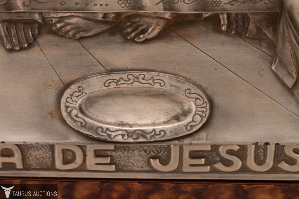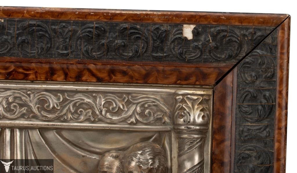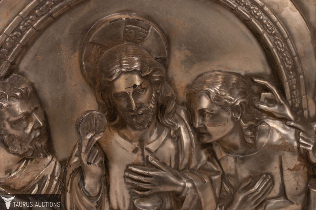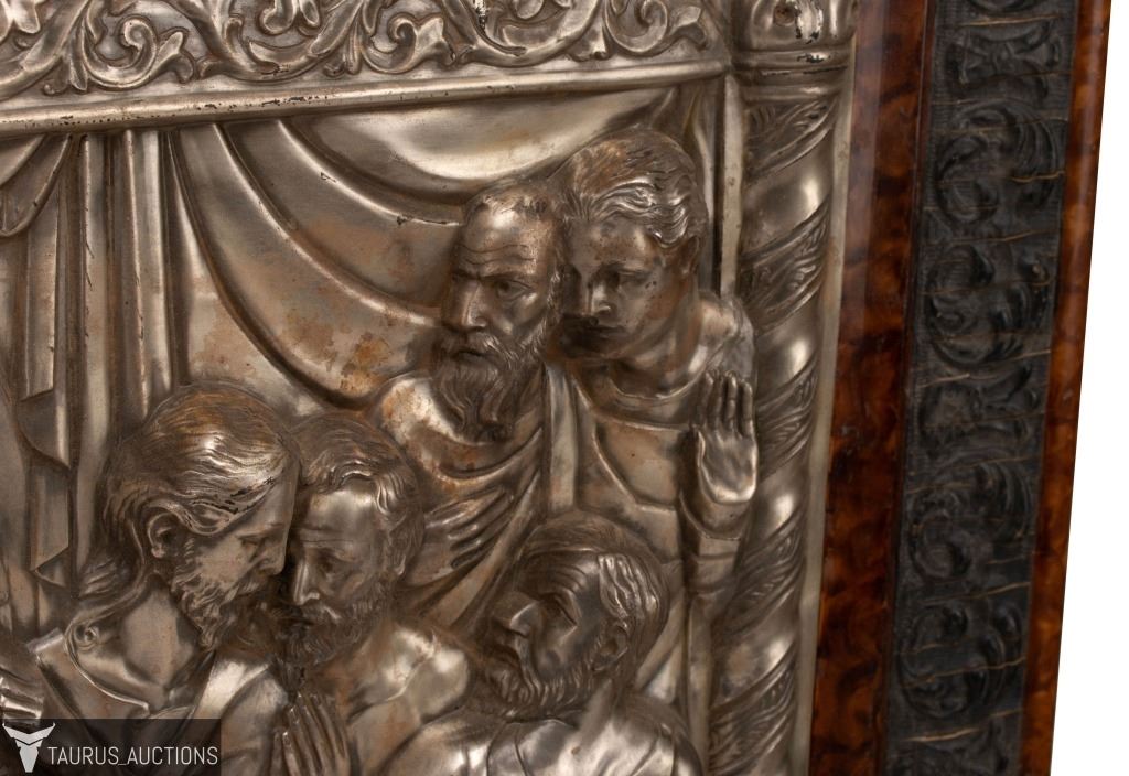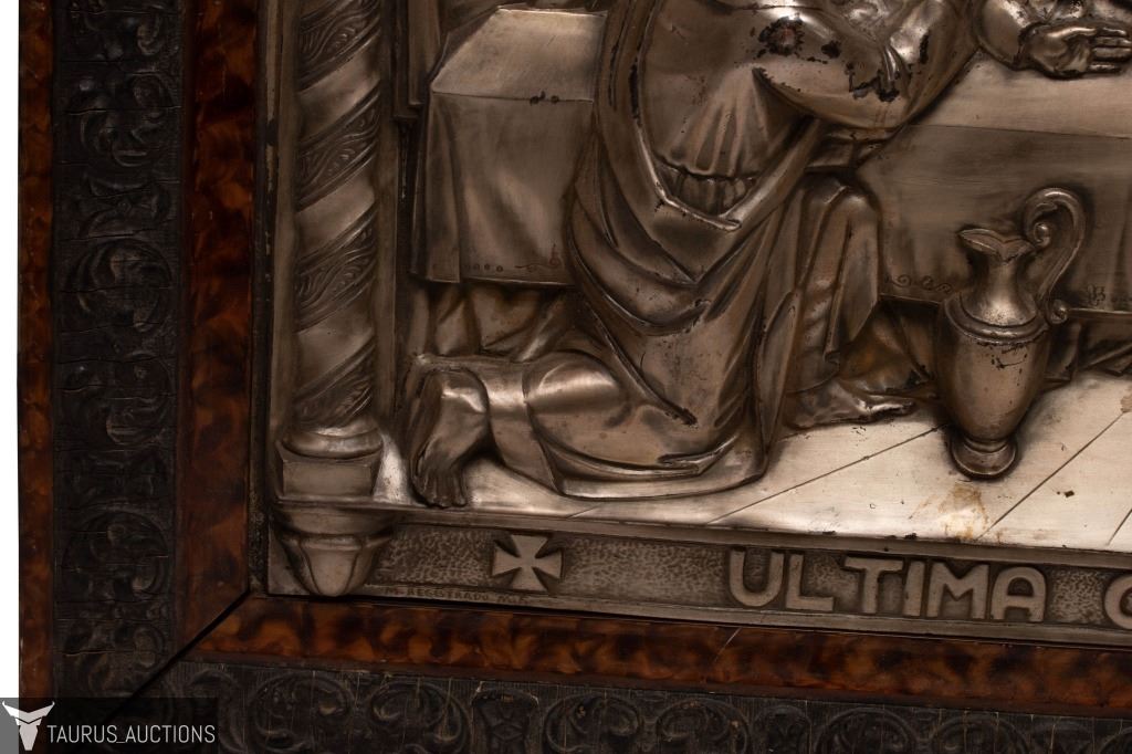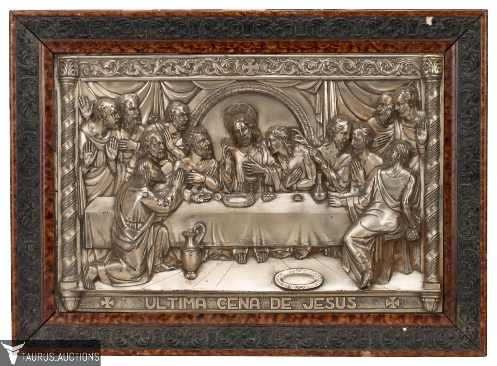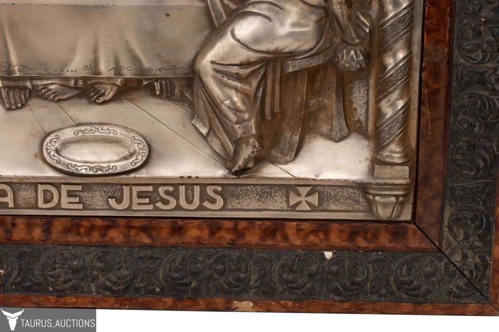 Item/Description: Antique metal repousse high relief nickel plated copper scene of The Last Supper. Jesus and his disciples. Expertly crafted, fine details. Crafted in Spain. Titled in raised print: Ultima Cena De Jesus. Bottom left: M. Registrado M.K. Elaborate embossed faux wood ebonized decorative frame. ( Christianity, religious iconagraphy)