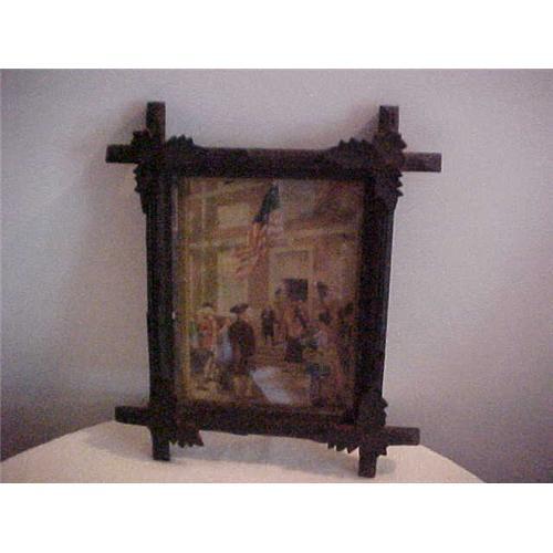 Litho; Reprint of The First Spangled Banner Raised At Independence Hall, June 14, 1777 in color ; In Picture Betsey Ross; Memb ers of Congress by Names- John Hancock, -Thomas McKean; Robert Morris, John Witherspoon, John Adams, George Washington on steps, Framed in Cross Frame; 8.75, X 10.75