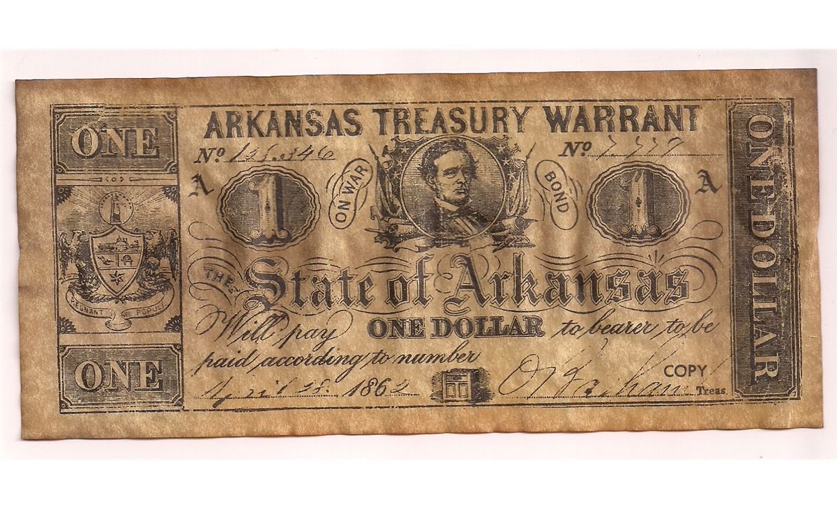 This is a COPY of an 1862 Arkansas Treasury Warrant. This One Dollar reprint makes a great collectible.