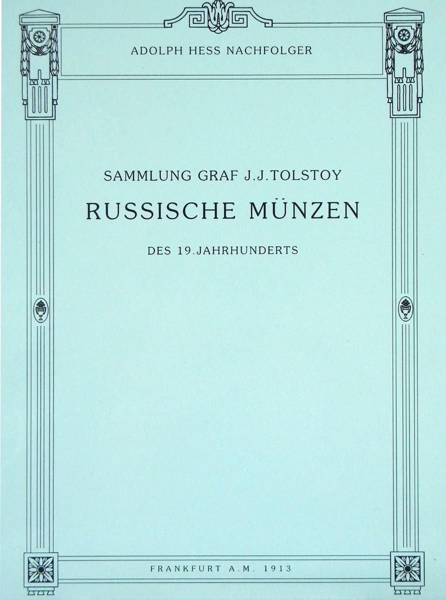 Hess, Adolf. SAMMLUNG GRAF J.J. TOLSTOI. RUSSISCHE MÜNZEN DES 19. JAHRHUNDERTS. 2002 Moscow reprint of the 1913 Frankfurt original. 4to, original laminated printed boards. (6), 85 pages; 3203 lots; 12 plates. Fine. A well-executed reprint of this highly important sale, with decent plates. Many of the great rarities depicted in the Georgii Mikhailovich corpus originated in the Tolstoï collection. “The finest 19th-century Russian collection ever auctioned, virtually complete. Virgil Brand and L.K. Josef (of St. Petersburg) were heavy buyers.” -- Journal of the Russian Numismatic Society, Spring 1988 issue. Originals bring well into four figures. Clain-Stefanelli 11228*. Grierson 308.