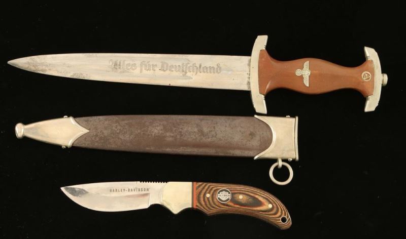 Stamped 'Paul Seilheimer Solingen' with sheath. Also included is a Harley Davidson knife with wooden handle and sheath.