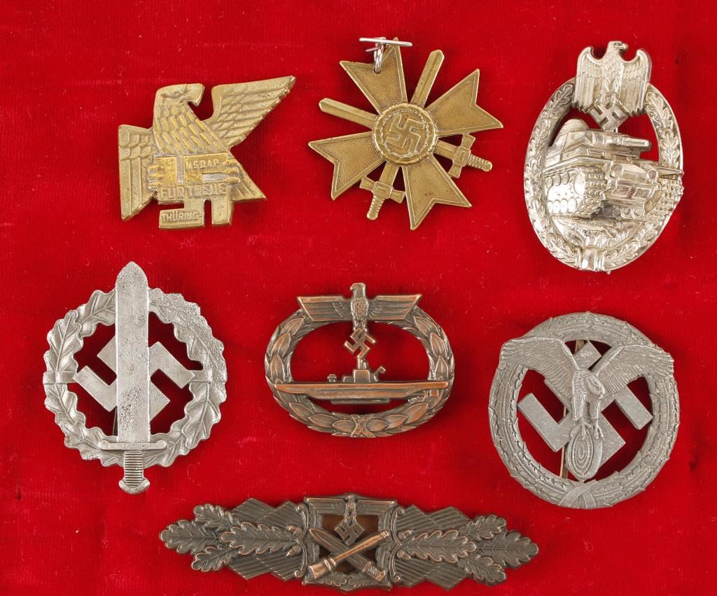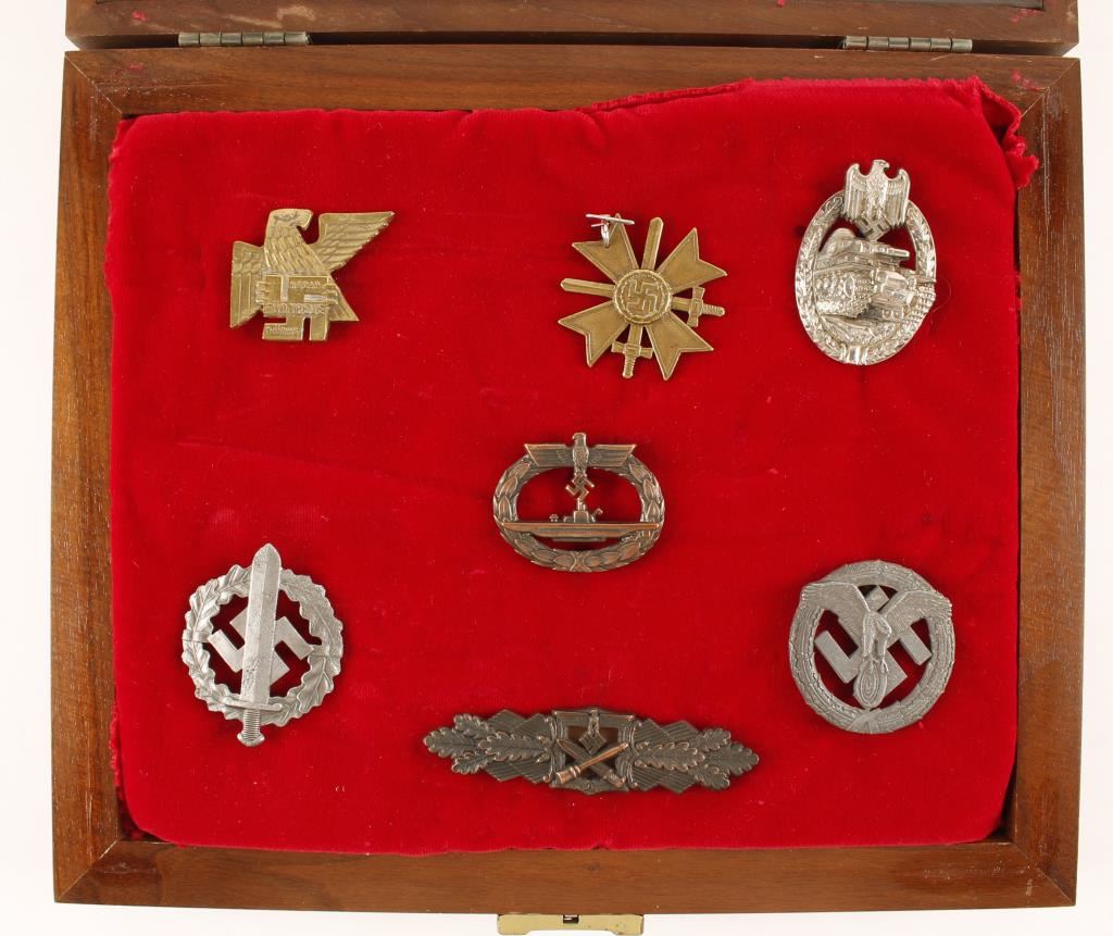 Including; Merit Award, Tank Assault Badge, Sports Award and 4 others. In wooden display case with red velvet lining. Measures