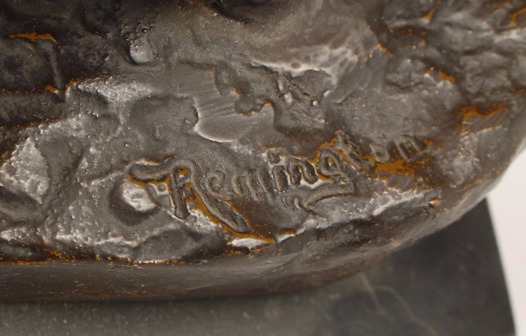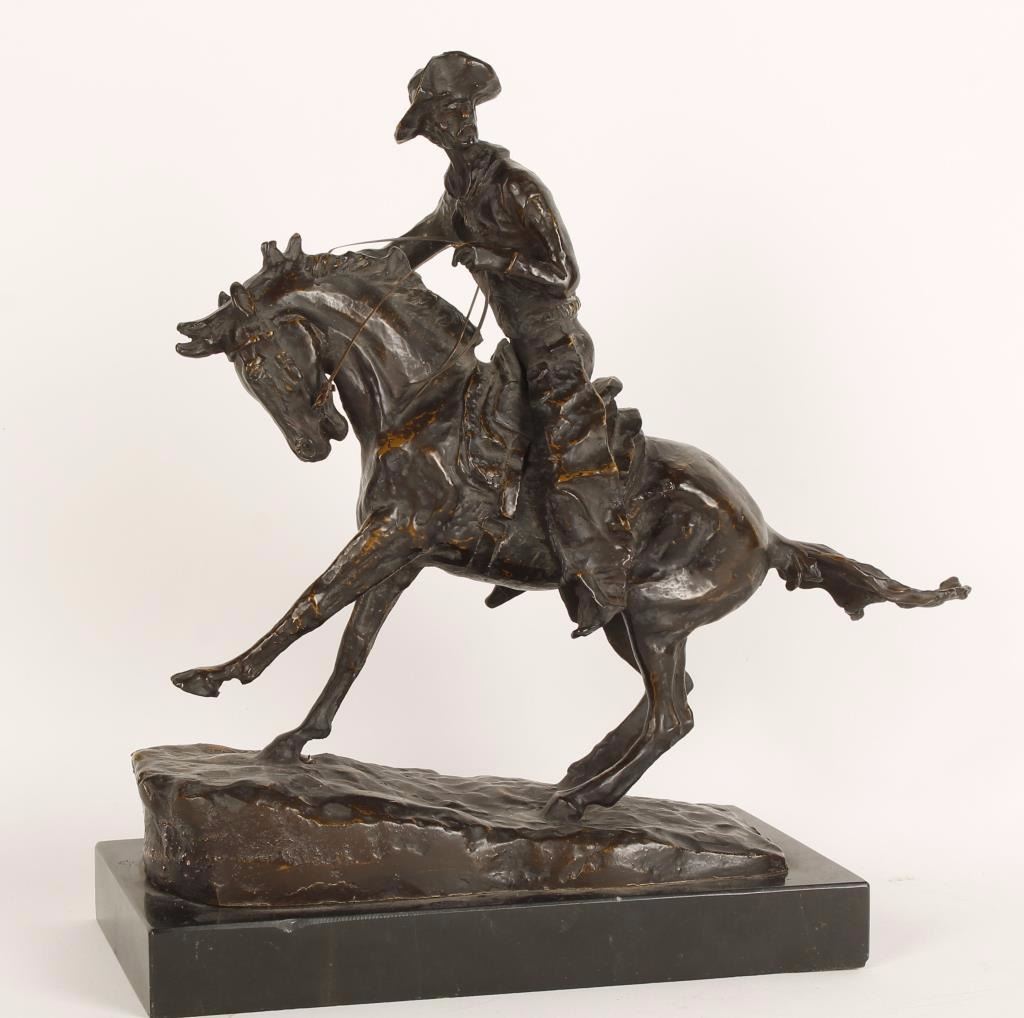 Well accomplished bronze reproduction statue of the iconic sculpture, "Cowboy" by Frederic Remington. Sits on a black marble base and measures 12" x 11" x 5". Has a nice brown tones. Condition is very good.