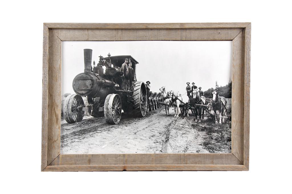 Reproduced B&W Photograph Depicting a Train Barn wood frame, image size is 36"x24".Barn wood frame, image size is 36"x24".