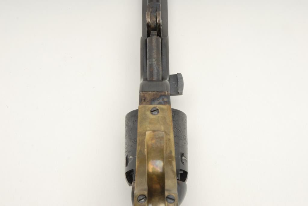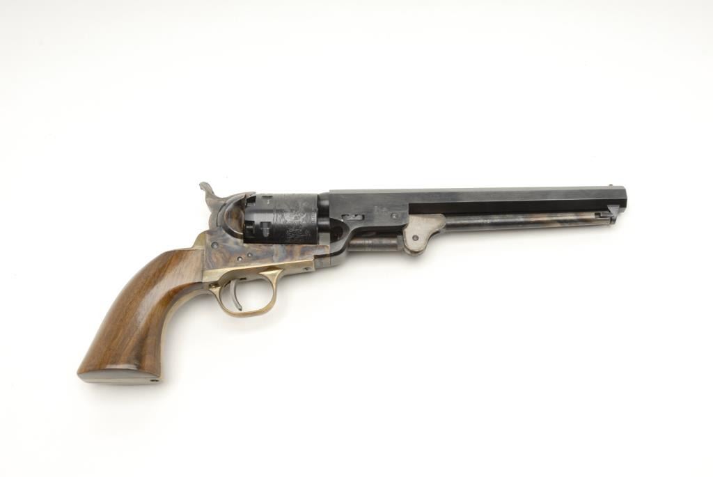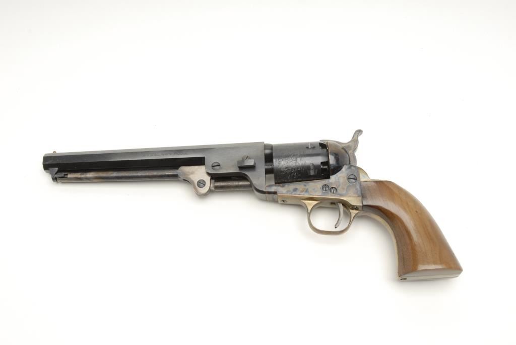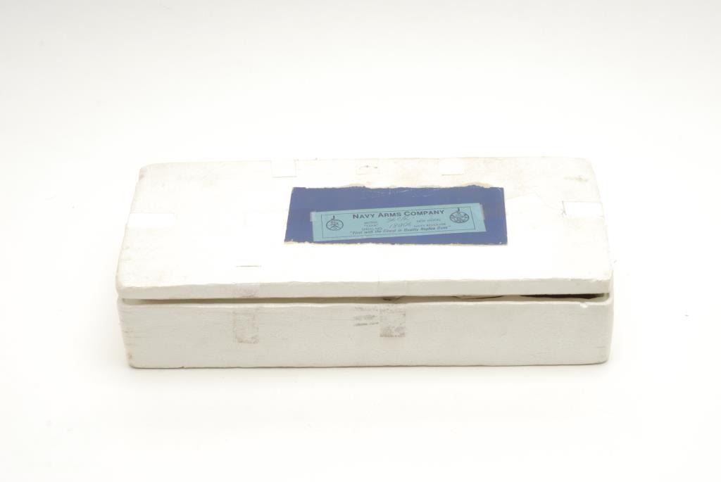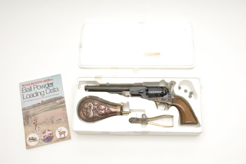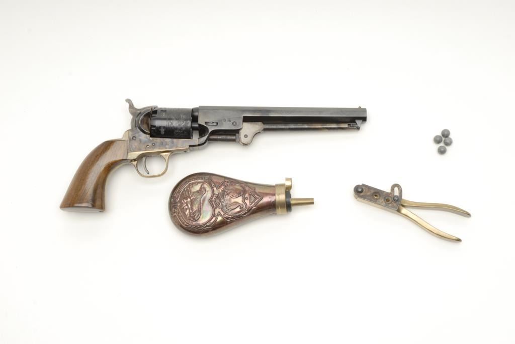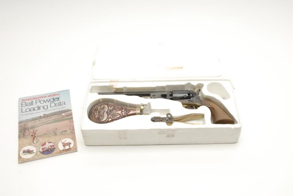 Reproduction 1851 Navy percussion revolver by Euro Arms., .36 cal., 7 ½” barrel, blue and case hardened finish, wood grips, brass back strap and trigger guard, S/N 18006 in Styrofoam insert with bullet mold and flask but no sleeve. The revolverremains in like new condition with little to no use. The grips are in excellent condition with some light scratches. The action is crisp. Est.: $100-$200