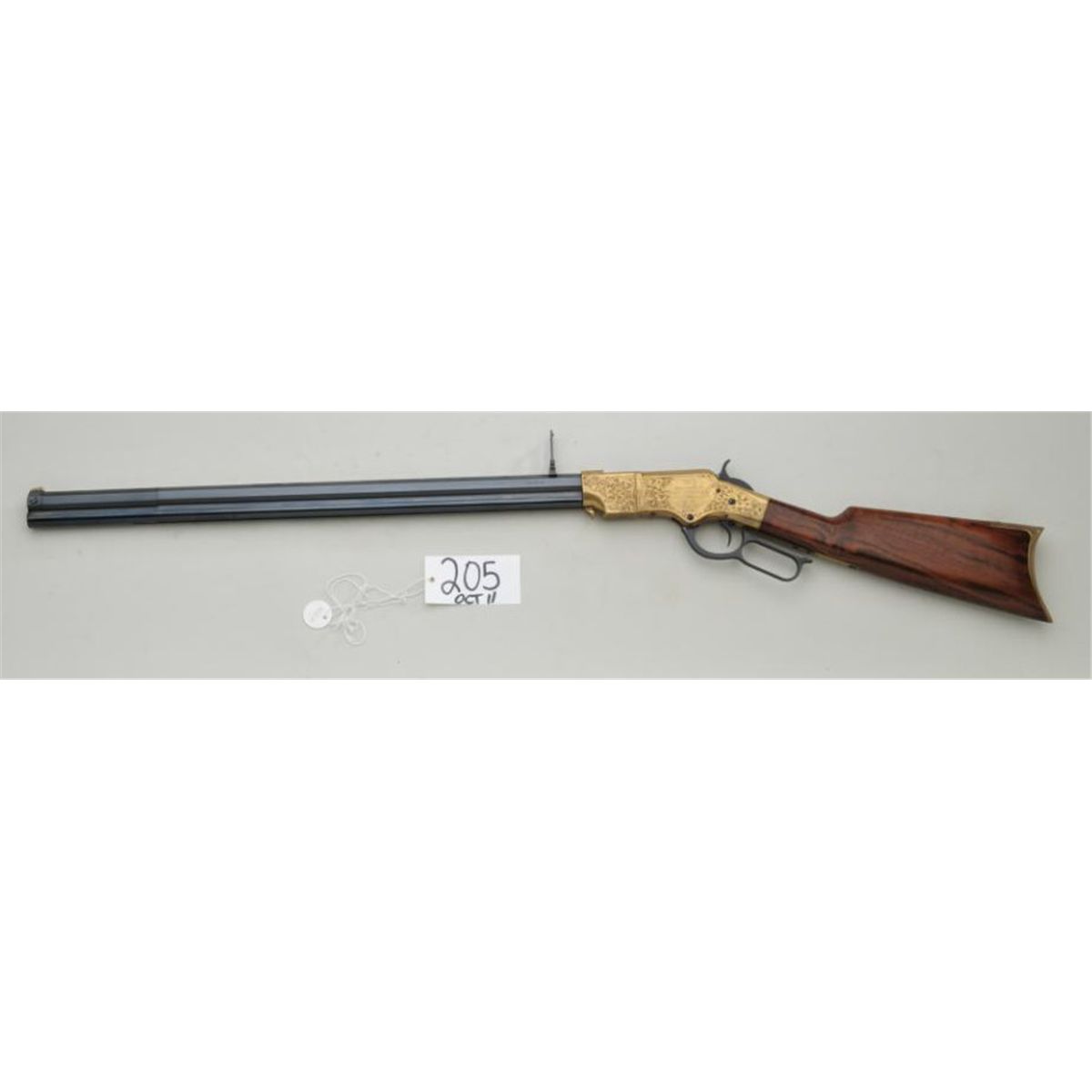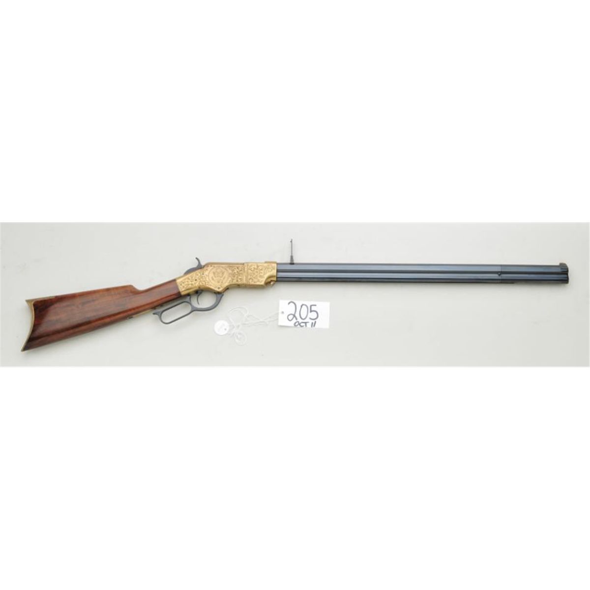 Reproduction 1860 Henry rifle by Navy arms, nicely engraved with presentation inscription “To Commemorate the 1980 International M. L. Championship in the USA” on center panel, American eagle and shield on right side,surrounded by good quality 19th century style scroll engraving. The breech end of the barrel is marked “U.S.M. L. 1.C.” The rifle is chambered for .44-40 caliber and has a select wood stock. Condition is fine to nearexcellent showing no firing or use, 98-99%. Mr. Robert Petersen was a sponsor of more sporting and shooting events than any other individual on the West coast, including the 1984 Olympics. From the Robert Petersencollection. Est: $1,500 - $3,000