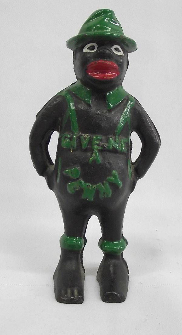 Reproduction Antique Black Memorabilia. Cast iron black man ''Give me a Penny''. Measures approx. 5 1/2''H x 2 1/2''W x 1 1/2''D. Buyers Pay Actual Shipping and Handling Charges(see terms and conditions for more information).