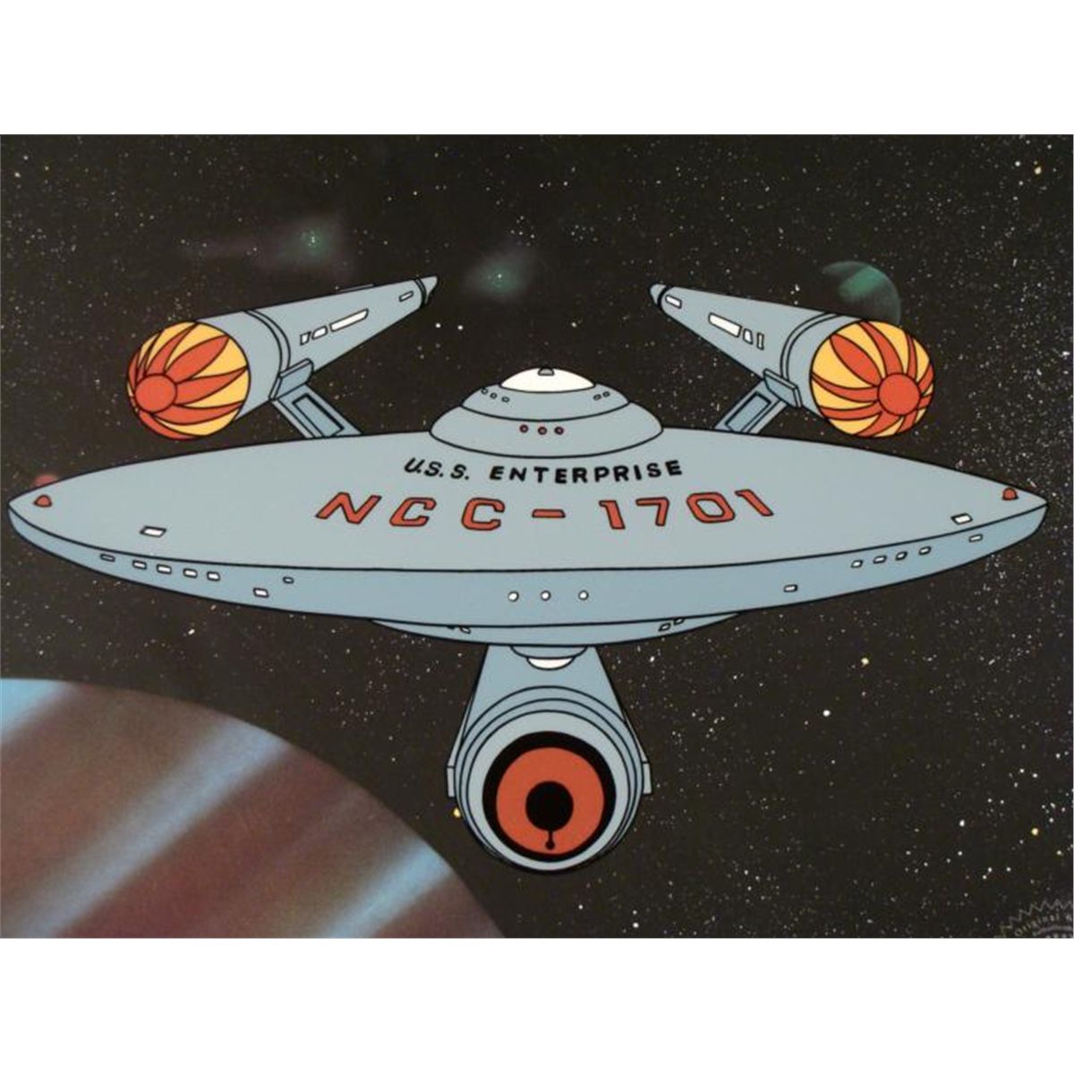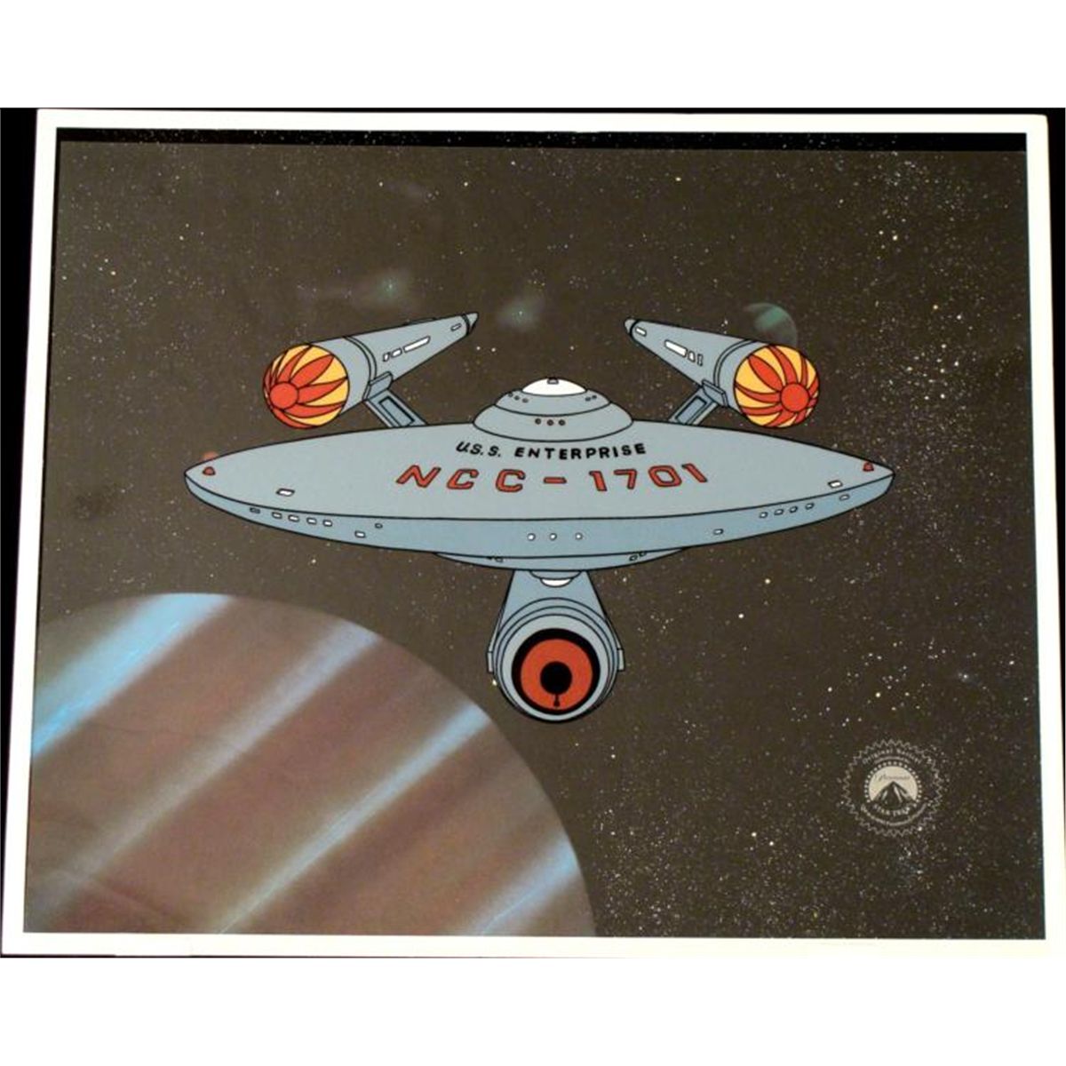 This is a Limited Edition Sericel from the hit television show Star Trek. Star Trek stories usually depict the adventures of humans and aliens who serve in Starfleet, the space borne humanitarian and peacekeeping armada of the United Federation of Planets. The protagonists are essentially altruists whose ideals are sometimes imperfectly applied to the dilemmas presented in the series. The conflicts and political dimensions of Star Trek sometimes represent allegories for contemporary cultural realities: Star Trek: The Original Series addressed issues of the 1960s, just as later spin-offs have reflected issues of their respective decades. Issues depicted in the various series include war and peace, the value of personal loyalty, authoritarianism, imperialism, class warfare, economics, racism, religion, human rights, sexism and feminism, and the role of technology. * * Depicted here is the Starship Enterprise NCC-1701 cruising at intergalatic speeds... * Original Printed Background and Animated Cel Overall Size of Background: 11 1/2" x 13 3/4" Overall Size of the Cel: 11" x 13" Excellent Condition This is an original hand-painted cel set-up used in the production of an episode of "Star Trek." Each one-of-a-kind set-up represents a slight change in position of the characters. When individually photographed and projected in rapid succession, the images appear to move. * To create production cels, the original animator's drawing is transferred onto an acetate cel (by hand-inking and/or photo copying). The cel is then hand-painted on the reverse side. The background accompanying this set-up is a reproduction background. * The printed background and cel are ready to be matted and framed. The Paramount Seal is located at the bottom right of the cel *