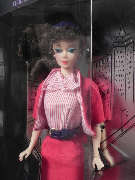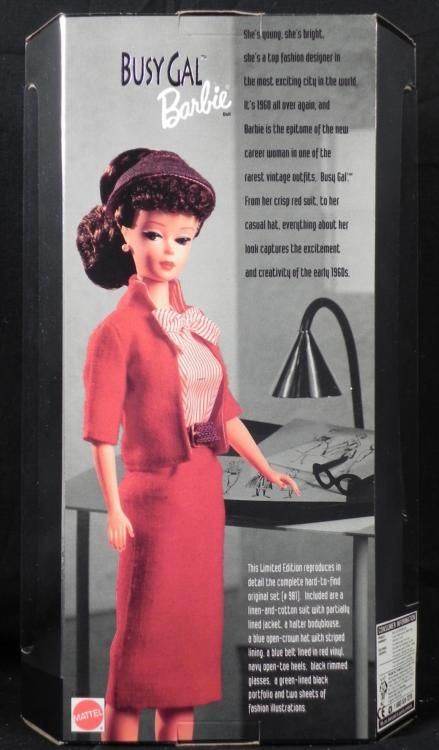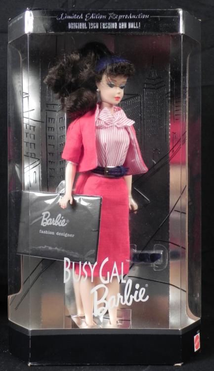 This Limited Edition reproduces in detail the complete hard-to-find original set (#981). Included are a linen-and-cotton suit with partially lined jacket, a halter bodyblouse, a blue open-crown hat with striped lining, a blue belt lined in red vinyl, navy open-toe heels, black rimmed glasses, a green lined black portfolio and two sheets of fashion illustrations. With all this going on, it makes sense why Barbie is a "Busy Gal"... * We are offering a very large collection of Barbie dolls that have never been opened, which came from an estate in Colorado. This wonderful collection contains hundreds of different dolls, dating back to 1962. This special collection of dolls and accessories were collected as a series and were completed over a period of 20 years. All of the items are in pristine condition and mint in box. We are proud to bring you this collection and sincerely hope that these dolls complete your collection of happiness. *