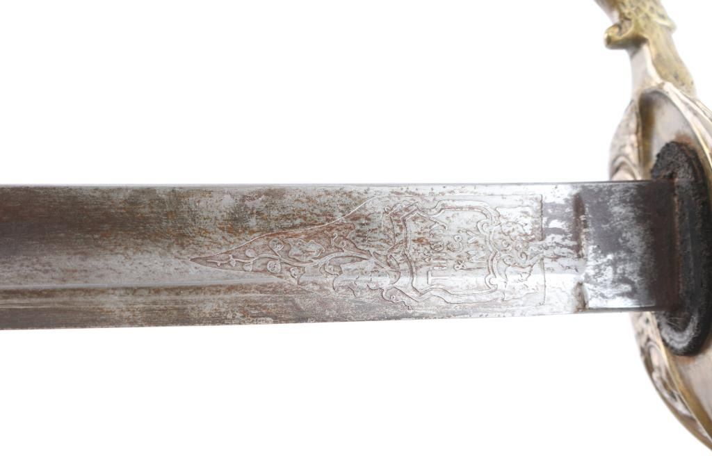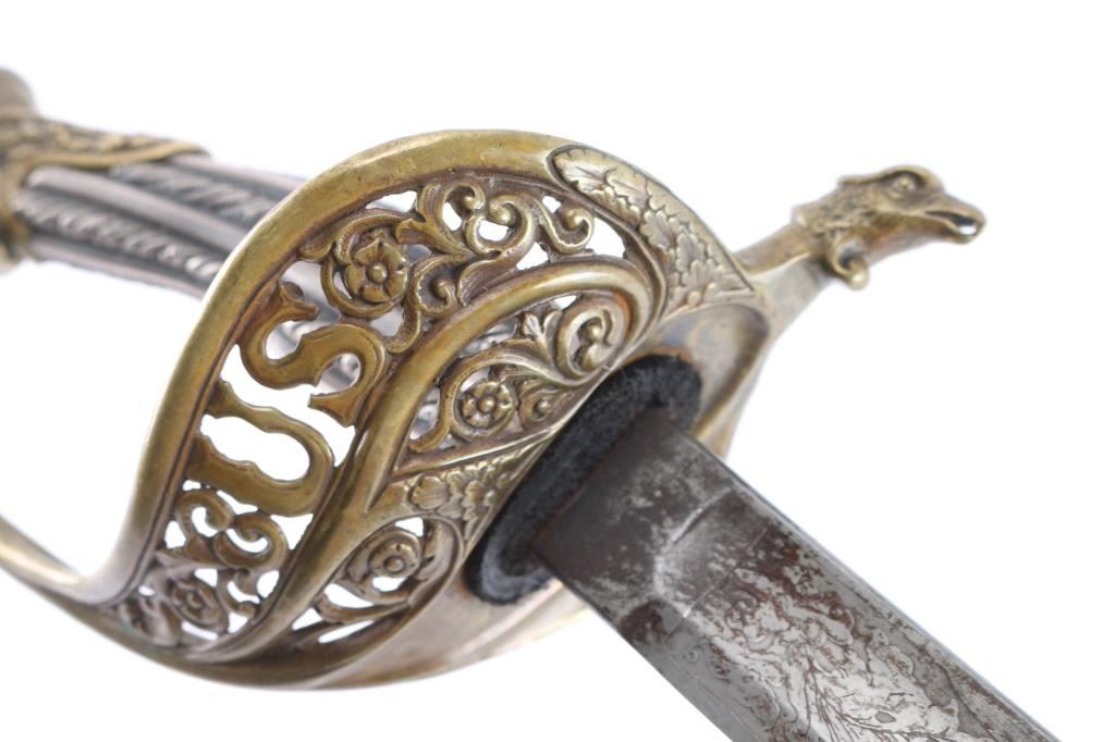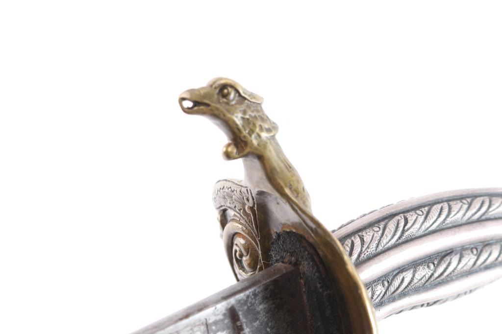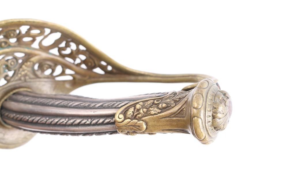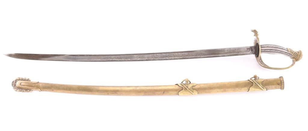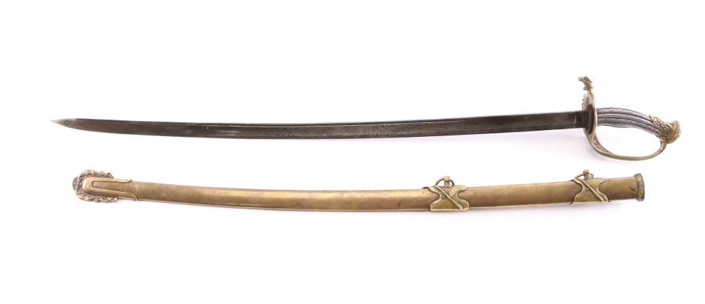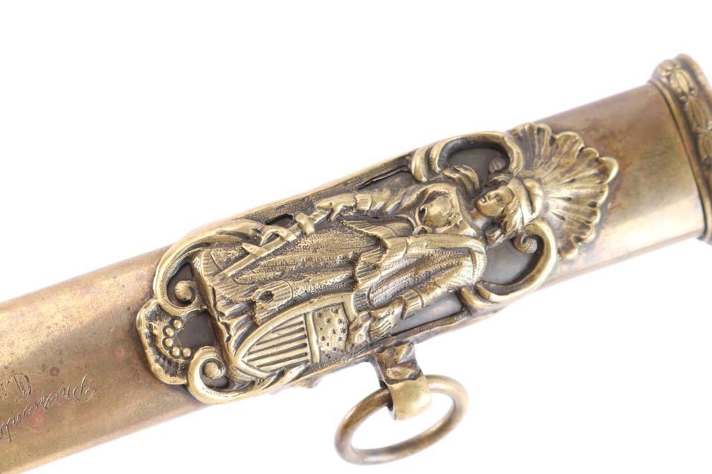 Very good reproduction ornate "Tiffany STYLE" presentation sword. large "US" in the openwork guard,quillon has eagle’s head jutting forward. The grip is silver, twisted with ridges and grooves. The 32 1/2" slightly curved blade is etched with "Tiffany & Co. NY" followed by a series of somewhat geometric floral scrolls followed by "US". The reverse has floral scrolls, followed by American shield, crossed cannons, stand of arms with crossed pikes/rifles with banners. This is followed by another series of geometric floral scrolls turning into a long, leafy vines. No nicks, 16" fuller along the flat. The brass scabbard matches the hilt in having a medium, aged brass patina, floral scrolls, figural ring mounts and screw-fastened, floral scrolled drag. The upper mount incorporates Lady Liberty holding a sword, and American Shield. The middle mount has a bearded charging Union soldier holding a rifle, with pack, bayonet, and "US" marked cartridge box. The inscription, between the ring mounts, with the recipient’s name in Old English and the rest in script: “Presented to / Col. Edward Lyon Bailey / 2nd N.H. Infantry Va. / Men of Co. A..” This is a very good copy sold by "House of Swords" in the 1960'"House of Swords" produced sand retailed as fantasy sword. They were copy's and or fakes resembling high-grade presentation swords. Often they used some real parts to include scabbards, scabbard mounts and blades. .