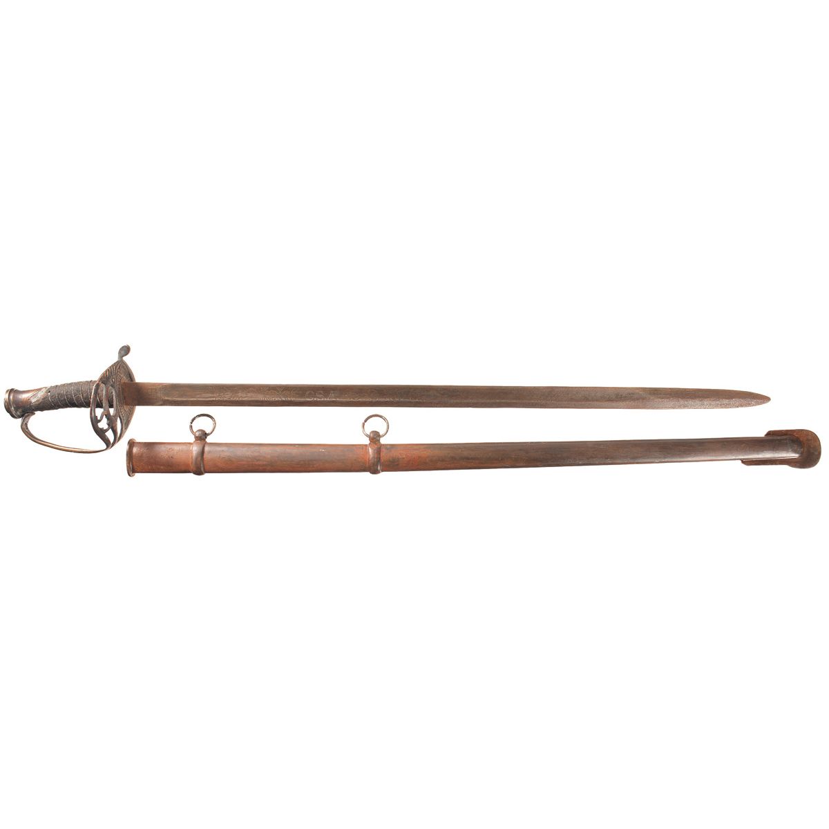30" blade, with hand stamped "NASHVILLE PLOW/WORKS" markings, Confederate-themed decoration, and a metal scabbard. Fair.
