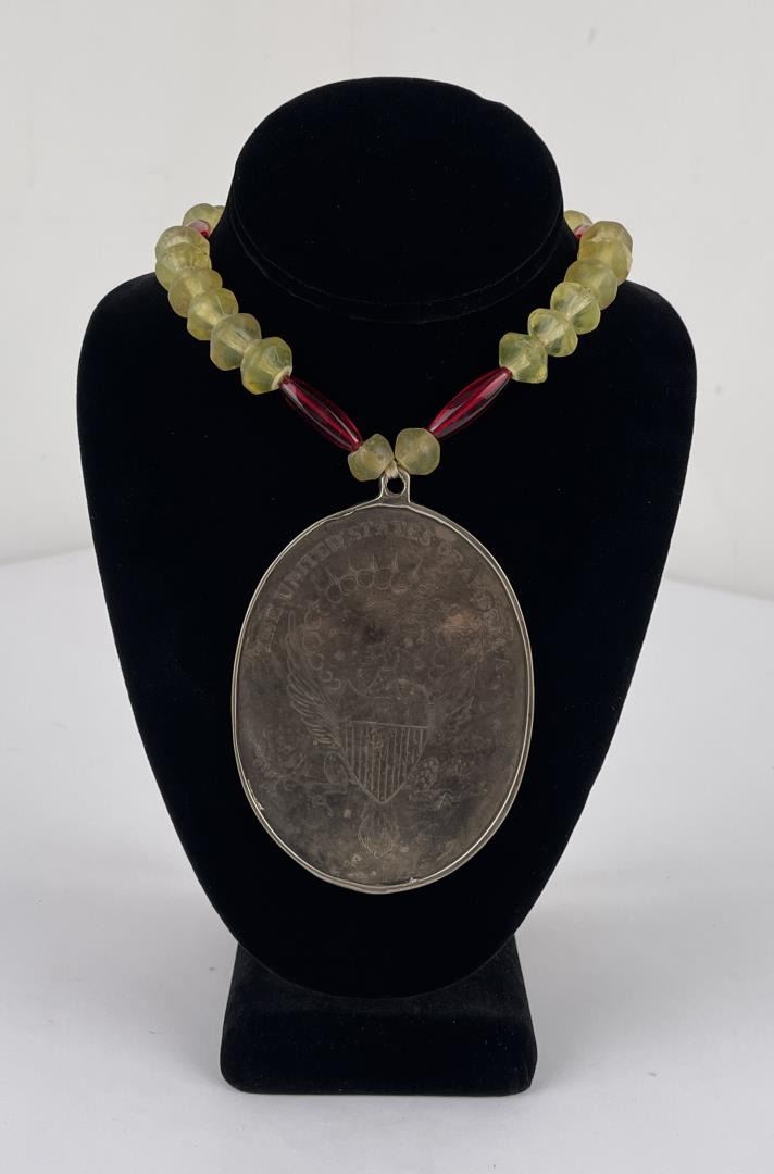 Medal is a reproduction of an early Indian peace medal. Metal is silver with antique trade beads. Allard Auction Collection Inv: MNS 21144